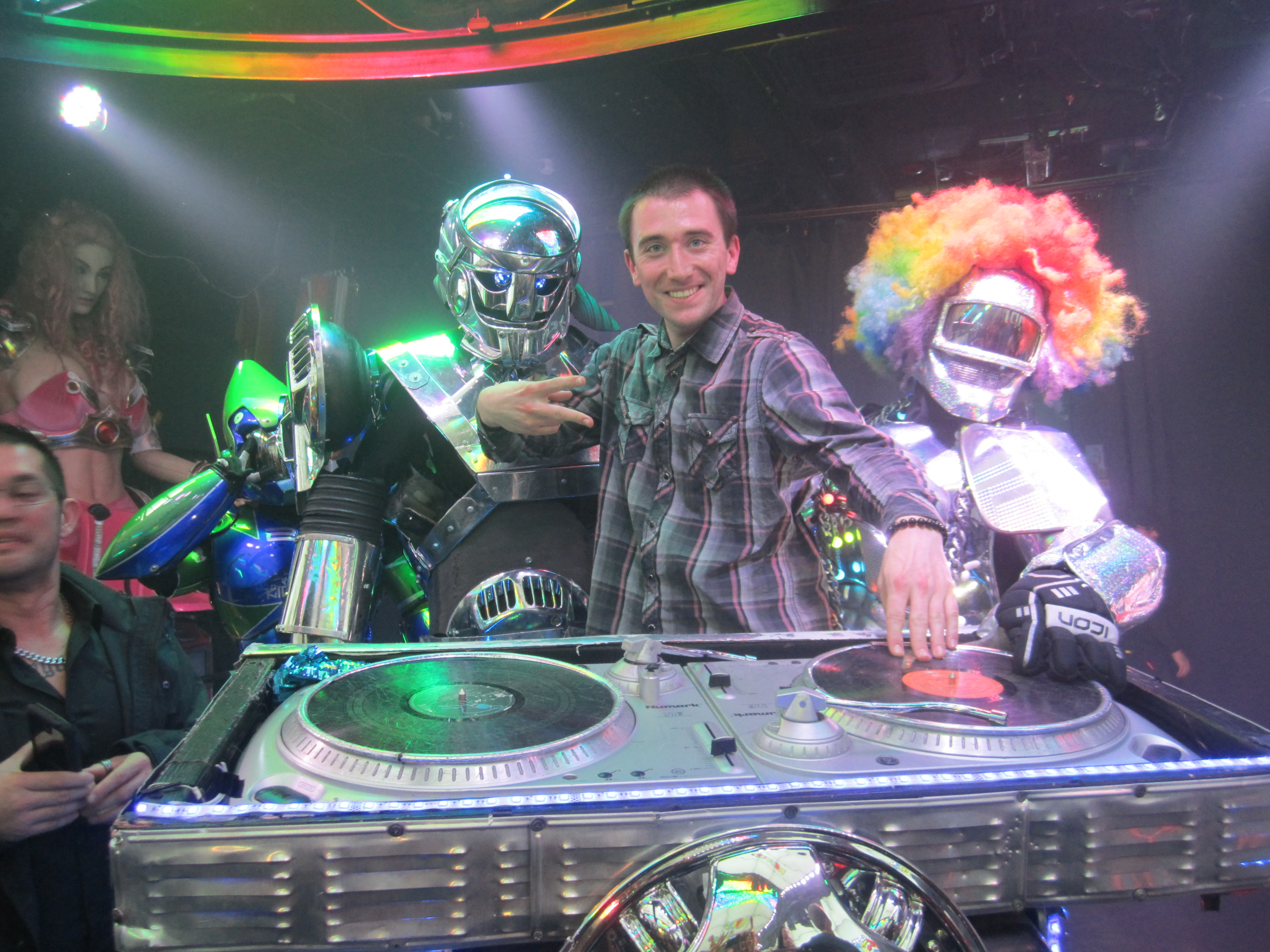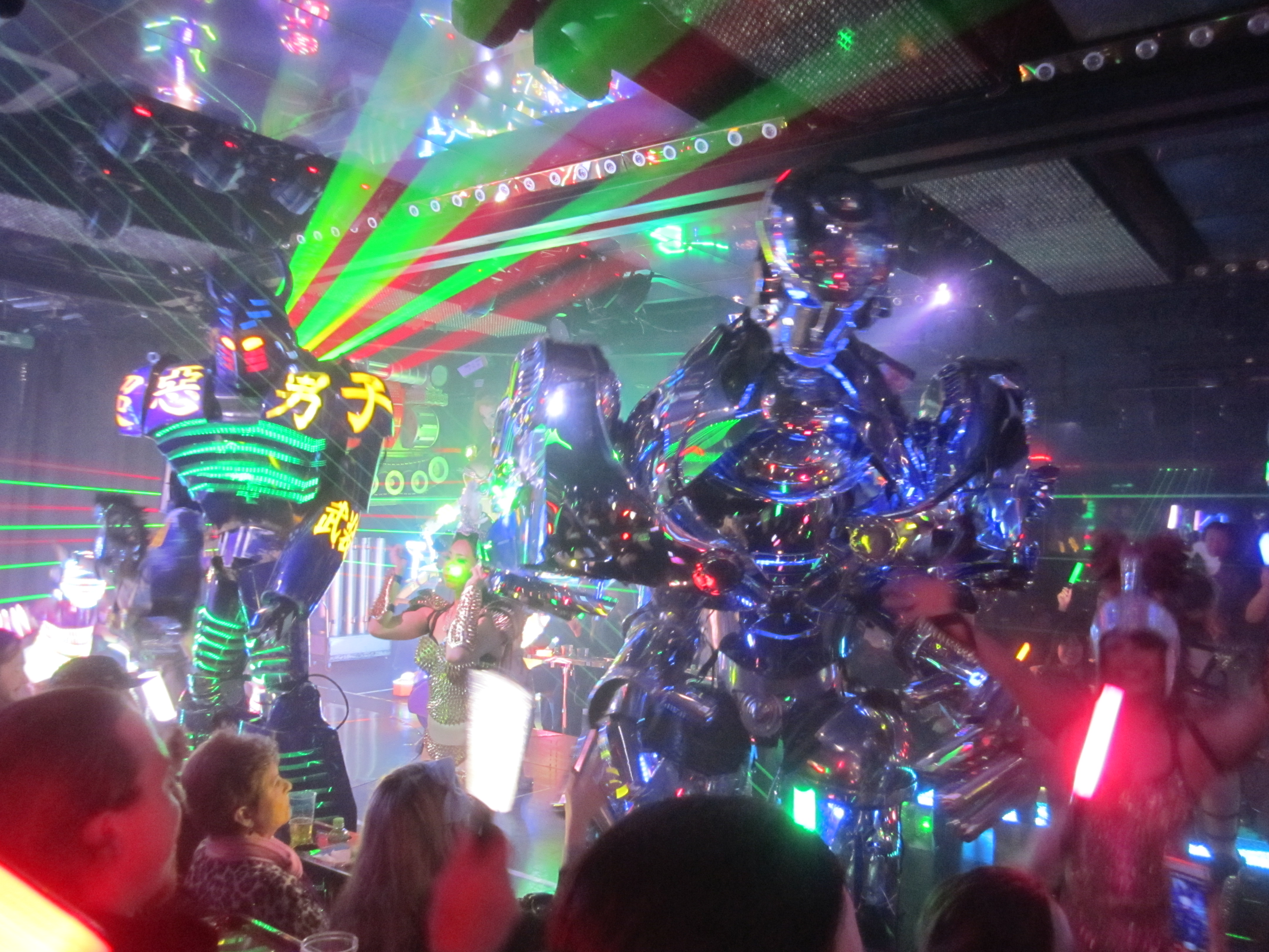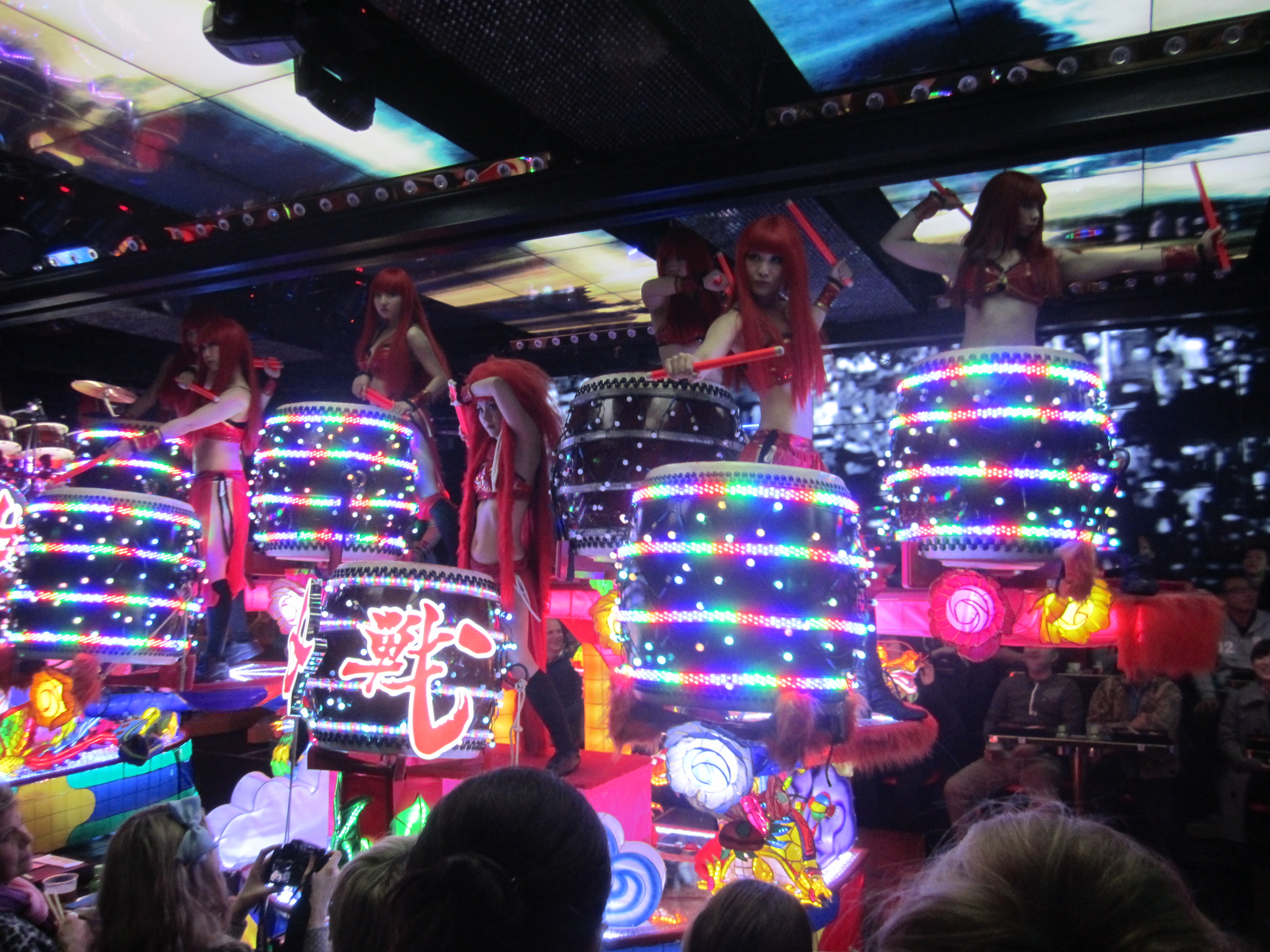 The gossamer thin sheet of dough encased a winter wonderland of snowy white whipped cream strewn about a generous slathering of chocotastic Nutella. It was the perfect compliment to watching the anti-Shinzo Abe/Olympics march going down the street. Eventually, I made my way to the Robot Restaurant which is located in Harajuku in the infamous Kabuchiko red light district. So while I was walking there, I was accosted by numerous guys in suits asking if I wanted some action at a very steep price. No, man! I came here to see some crazy robot action with very attractive women dancing. I highly recommend making reservations in advance, and if you sign up with a friend you get 50 percent off your 5000 Yen ticket. I got there, and they had a complete robot band in the lobby rocking out with some tunes.