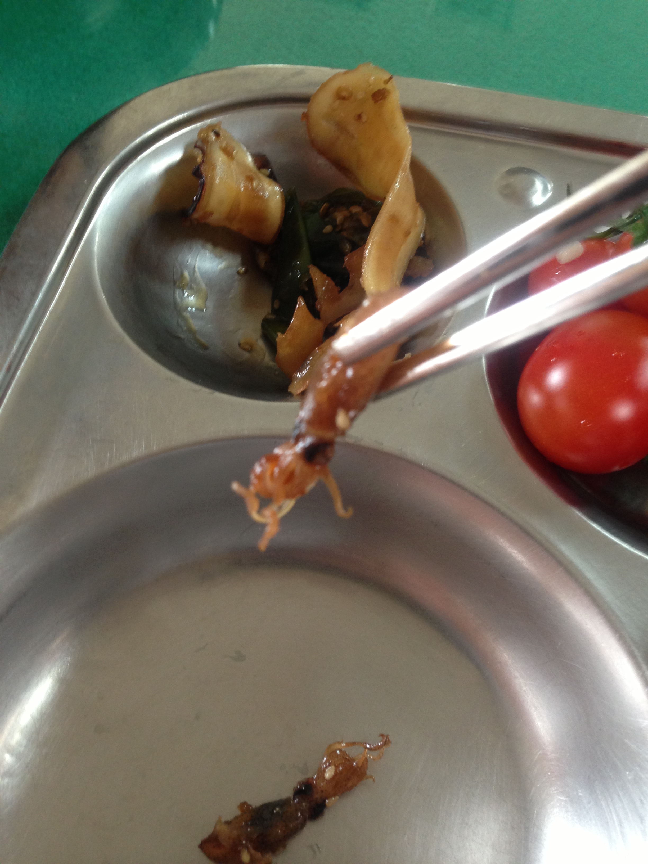 I chopsticked one into my mouth, and I realized that it was 순대 or Sundae. However, instead of a rich mix of vanilla, butterfat, and chocolate syrup, I was greeted with a semi-coppery flavor of blood sausage. If odd textures disgust you, stay away from this sausage’s rubbery skin. It was somewhat similar to the Polish kiszka, but the Korean blood sausage had noodles on the inside of it which kind of put me off of enjoying it more. A more positive experience during school lunch was when they were serving stir fried baby squids. Now, I’m not the biggest seafood fan in the world, but I’ve found after living in Korea that they make some mean squid dishes. This meal was no different.