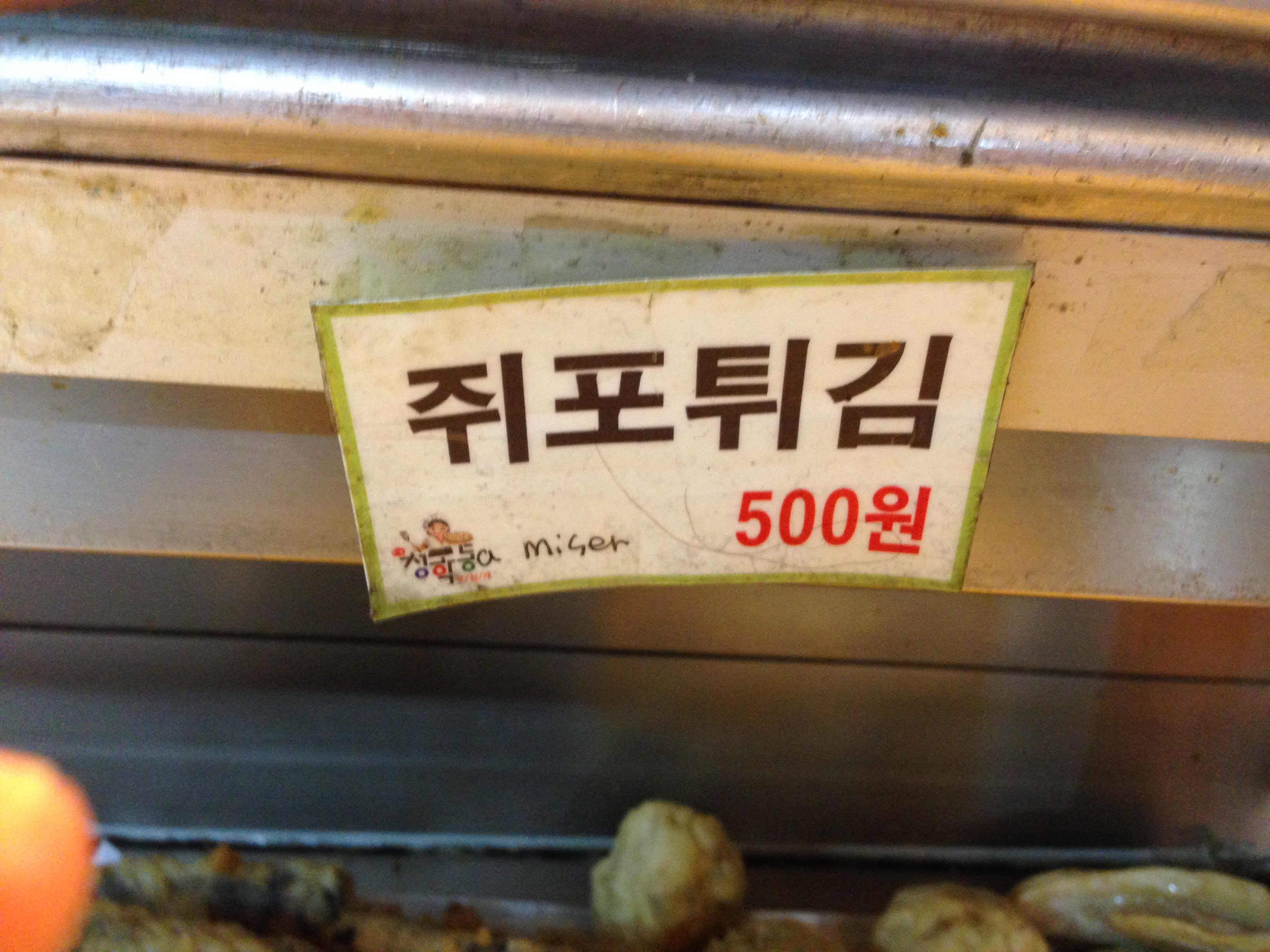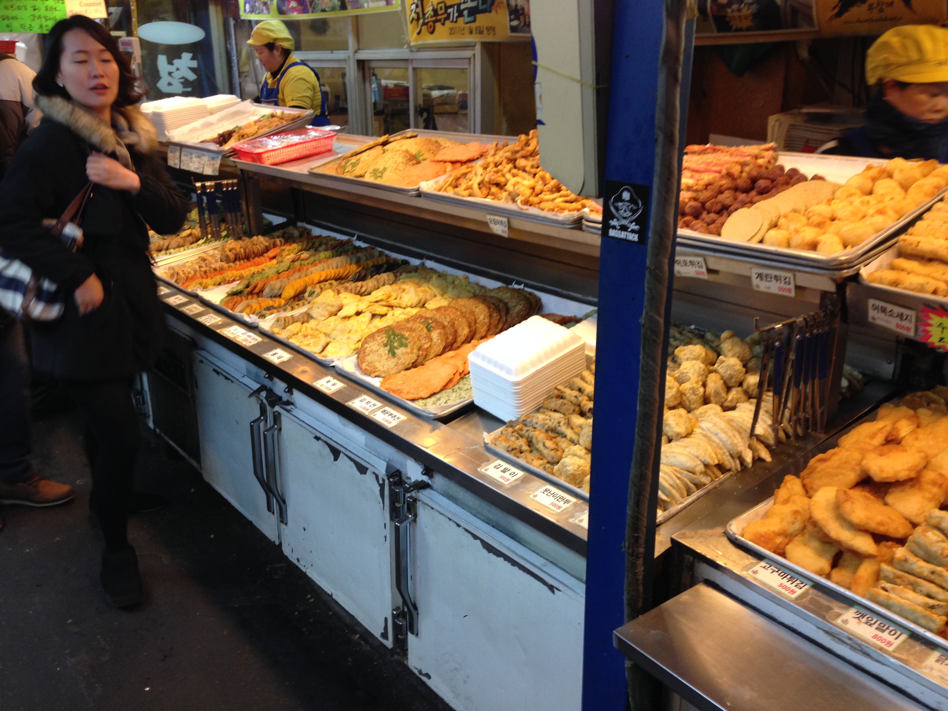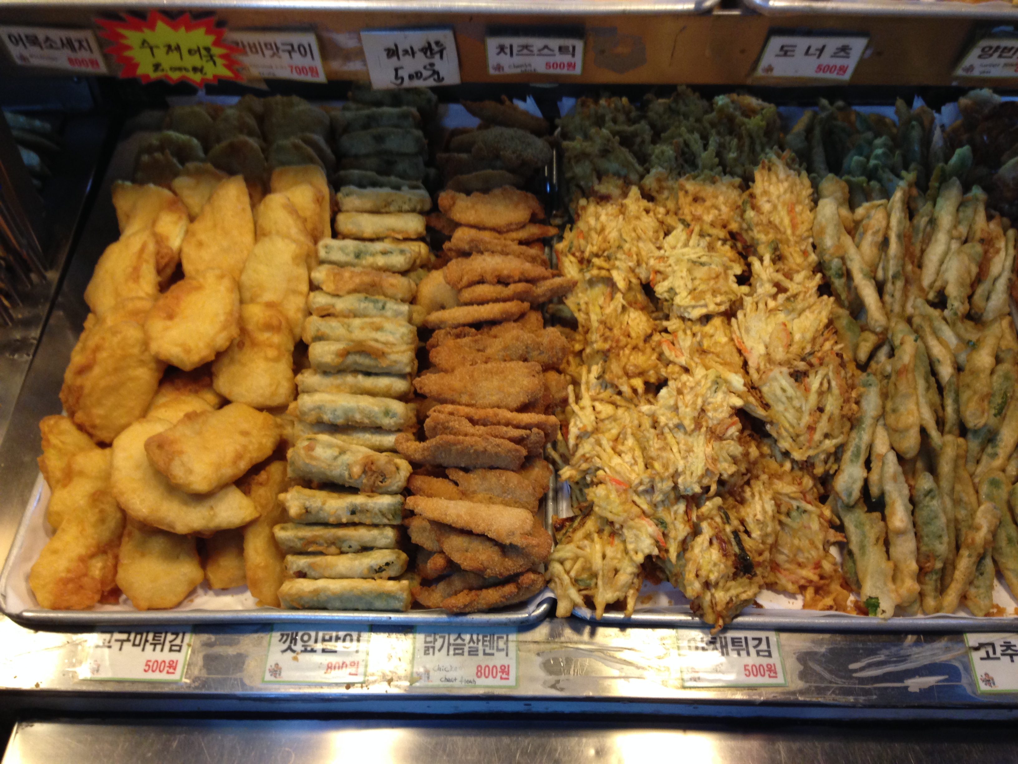 First off, I would have never found this place had it not been for the luck of my friend, Steph, who found this fried food heaven on the internet. Naturally, she shares my same sense of culinary curiosity, so we made plans to go there after a very long work week. After going out exit five and going left, we were quite lost. I looked to my right in the distance, and I could see an alley that seemed to be more bustling than the others, and we were greeted by incredulous looks by the restaurant owners at the fact that two waygookins (foreigners) were in this labyrinth of produce and meat. After walking past a few eateries, I could see plates piled high with pork knuckle and no fried food. They sent us further down the main road, and we finally saw the promised land. They had a mind-boggling variety of tasty morsels to try that ranged in price from 500-5,000 W per piece.