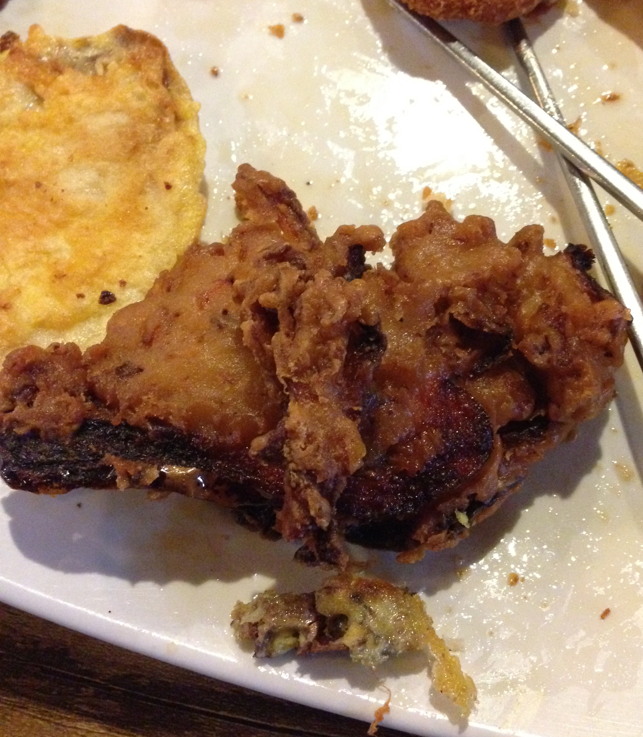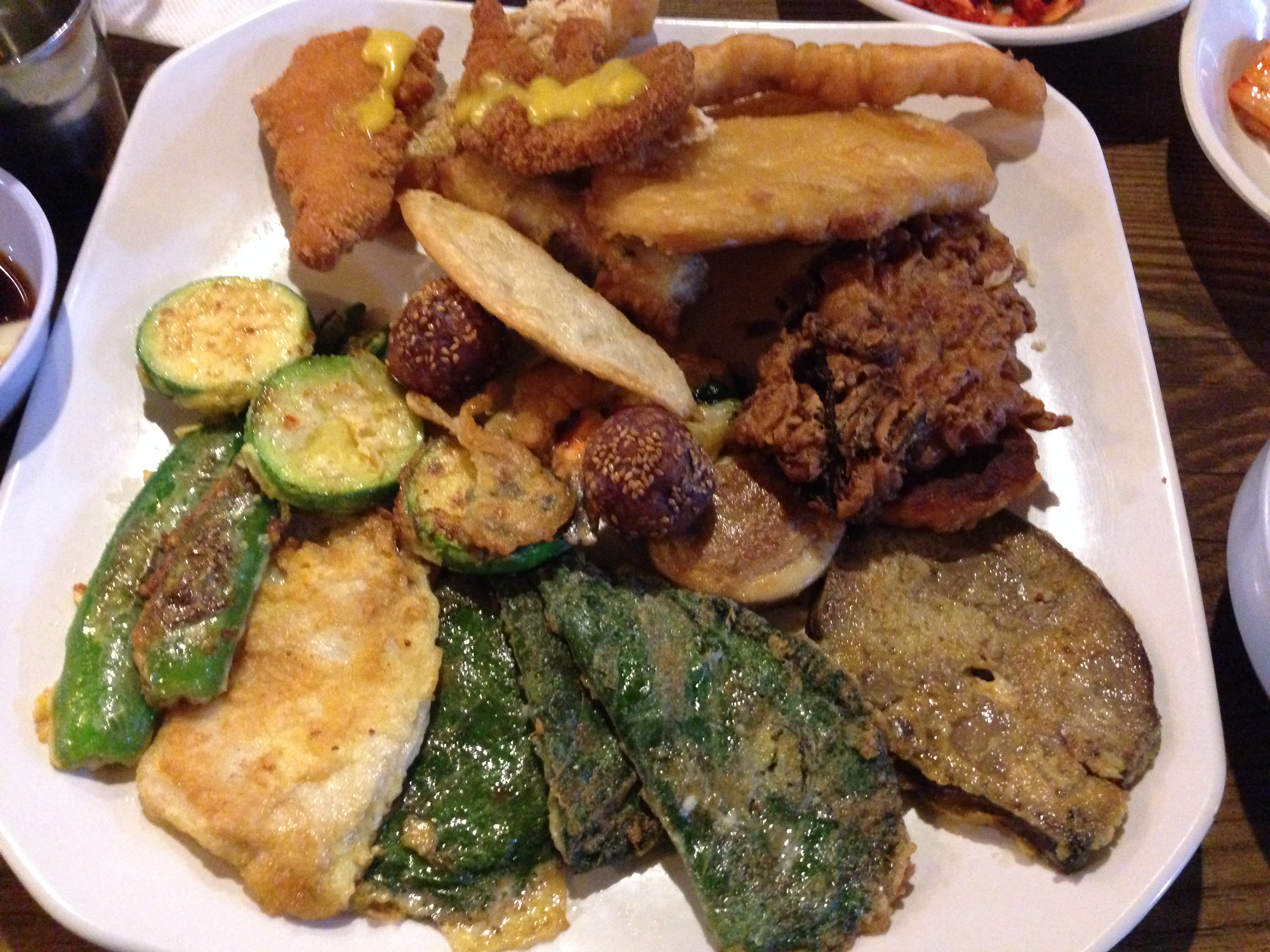Within our fried cornucopia that lied on our table just beckoning us with its golden-hued breading, we had more conventional foods like gooey Western style cheese sticks and crunchy chicken tenders that came with a complimentary drizzling of honey mustard. Then there were pieces that were more Korean like the squid tentacles, kimchi pajeon, and various forms of sweet potato which I was semi-averse to since I prefer regular potatoes. It still was a nice contrast to the savory, semi-greasy breading. An interesting selection in the mix was the fried beef liver. Texture-wise, it was quite firm, and it had a rich beefy flavor with plenty of body. I greatly enjoyed the fried cucumbers, chilies, and pork stuffed perilla leaves as well. Plus, they had plenty of different forms of taro root like the purple sesame seed coated balls you see on the first plate. So for all you vegans out there, there is plenty of selection for you too aside from that last one. There was also a mystery nugget that I chose because it looked like it had a strip of bacon in it, and I loves me some bacon.