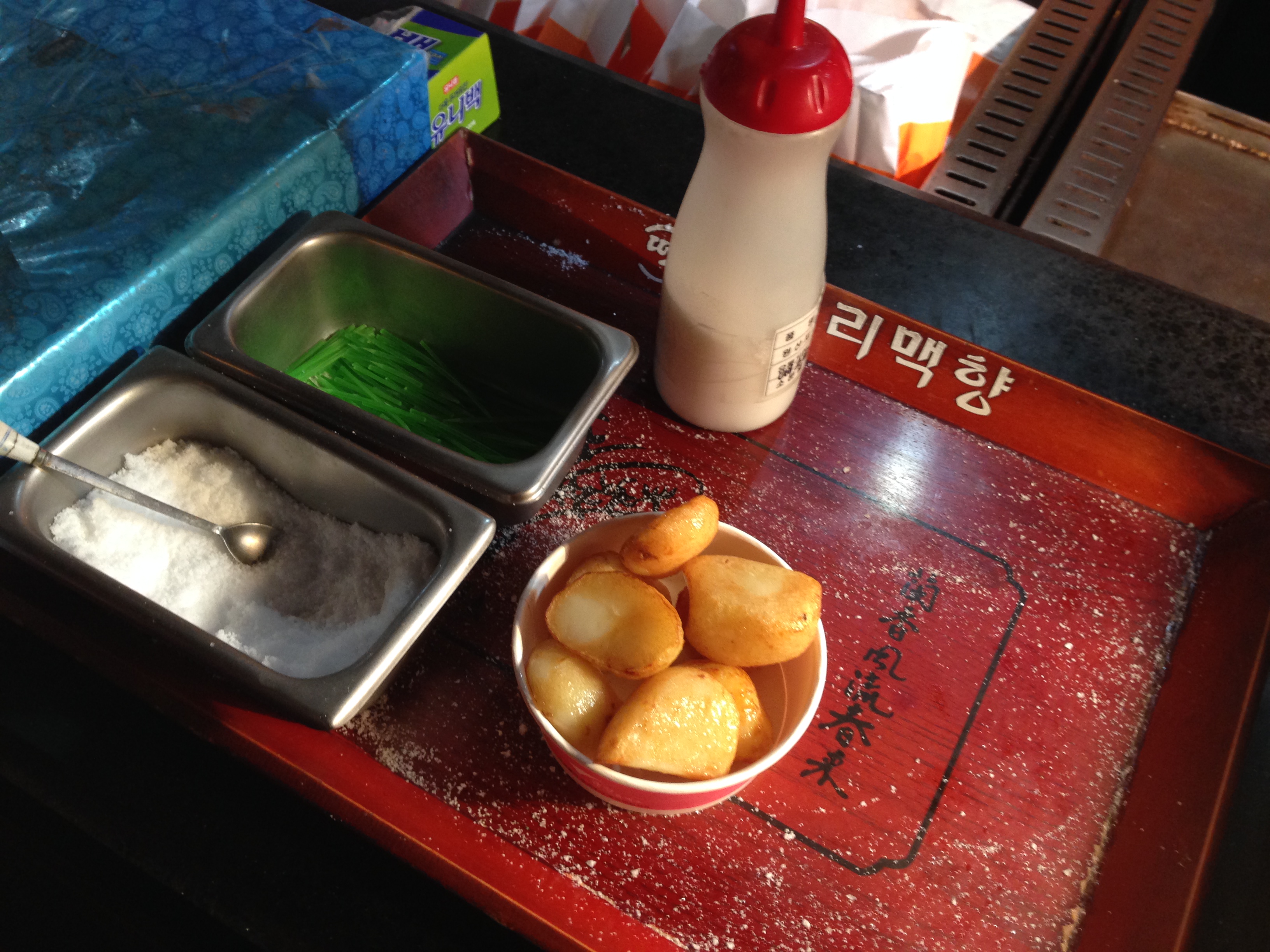 It was pretty straight forward as they were just chunks of steamed potatoes with a bottle of salt and a tin of sugar on the side for your own discretion. I shook and scooped a generous helping of each on the cup and made our way to a table.
