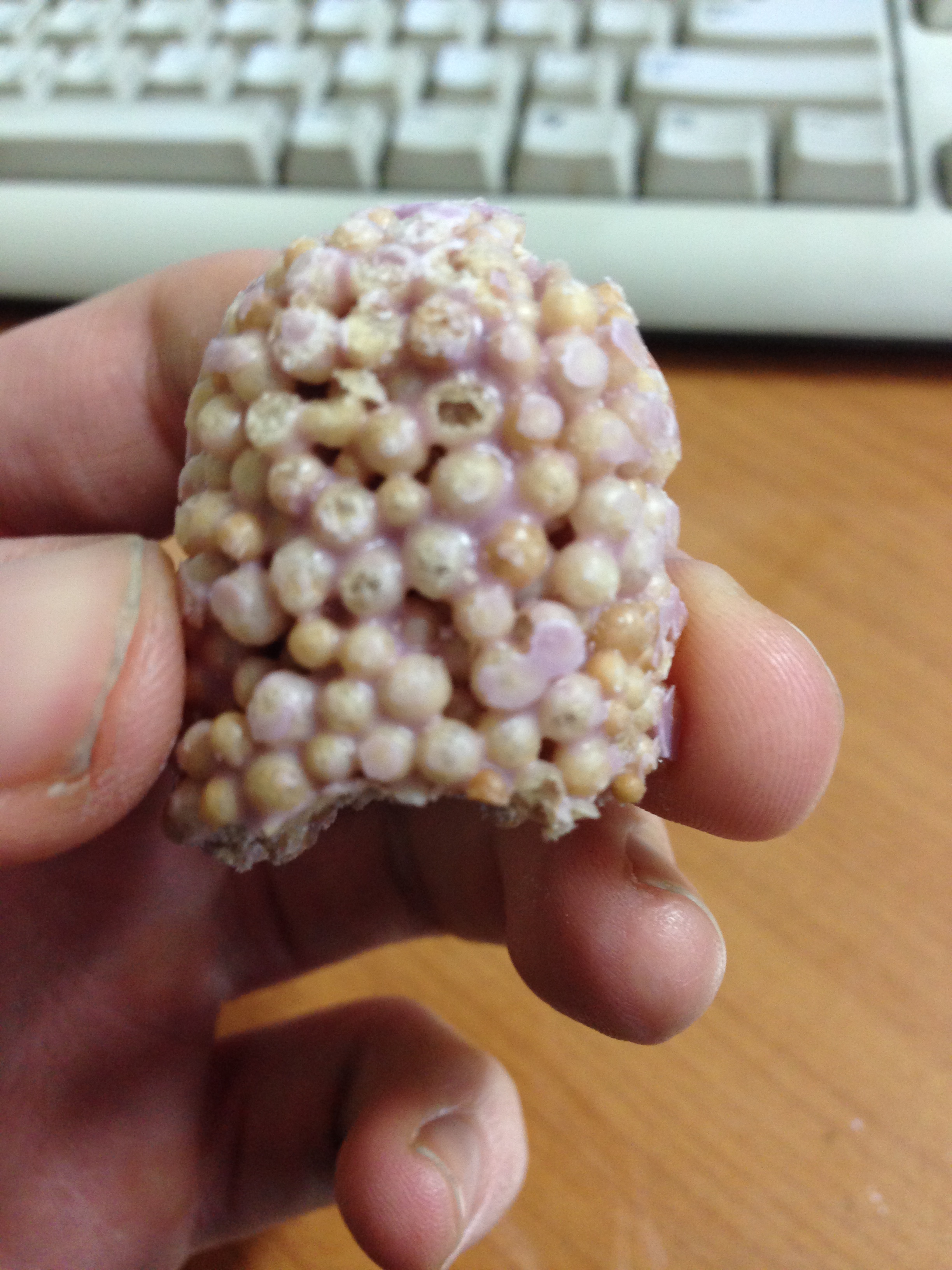 Jeju is an island off the southern coast of Korea, and is considered to be the Hawaii of Korea due to its beautiful sandy beaches, mountain climbing, and outdoor sex museum (wait, that’s not right…but it’s true for Jeju!). Culinarily, they are known for their black pig barbecue and even horse meat, but throughout the year my kids would always give me Hallabong chocolate which was often in the shape of these mini-Easter Island-esque stone statues that dot the landscape around the island. The Hallabong chocolate would often be infused with fruit flavors especially Jeju orange and sometimes raspberry. However, I had never seen this crunch chocolate until last week, and what made it especially unique was the cactus element. I knew that Jeju’s climate was warmer than Seoul’s, but are there really are cactii on this volcanic island? When I unwrapped it, I was confronted with what seemed to be a naked crunch bar with a moderate coating of pink chocolate.