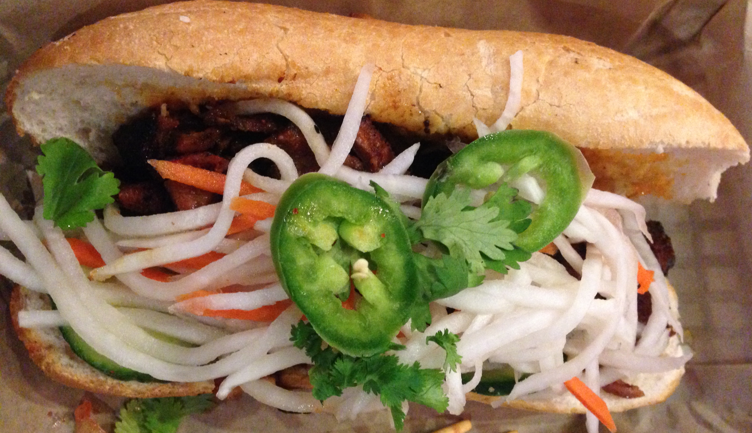 I met up with my friend, Heidi, yesterday since we recently came back from a year in Korea together.  While we were both happy to be back in the good old USA, it felt only fitting that we caught up on things over the food that we tried throughout our adventures in the Land of the Morning Calm.  I was a bit surprised to find it in the neighborhood by DePaul and not in Koreatown, but that didn’t stop me from enjoying my dining experience from beginning to end.IMG_3090 Upon walking in, I was surprised to find the place was kind of like a Far East Asian Chipotle where you have to order your food and then sit down at a table with a number.IMG_3097 Looking over the menu, I could see that it wasn’t quite the Korean cornucopia I was expecting.  While they did have some classics I’ve enjoyed like 비빔밥 (bibimbap; mixed vegetables and rice bowl), 김치볶음밥 (kimchibokkeumbap; fried rice with kimchi), and the ubiquitous 김치 (kimchi; pickled cabbage), they were missing other common dishes like 떡볶이 (tteokbokki; rice cakes in spicy sauce) and 잡채 (chapchae; translucent fried noodles).  Instead, they were replaced with Korean fusion treats like tacos, banh mi, and kimchi poutine.  I wanted to try a bit of everything, so I got the following:  a 갈비 (galbi; bbq beef ribs) taco ($2.95), a spicy bbq pork banh mi ($6.25), and a small cup of kimchi ($1.50) since I love my pickled vegetables.