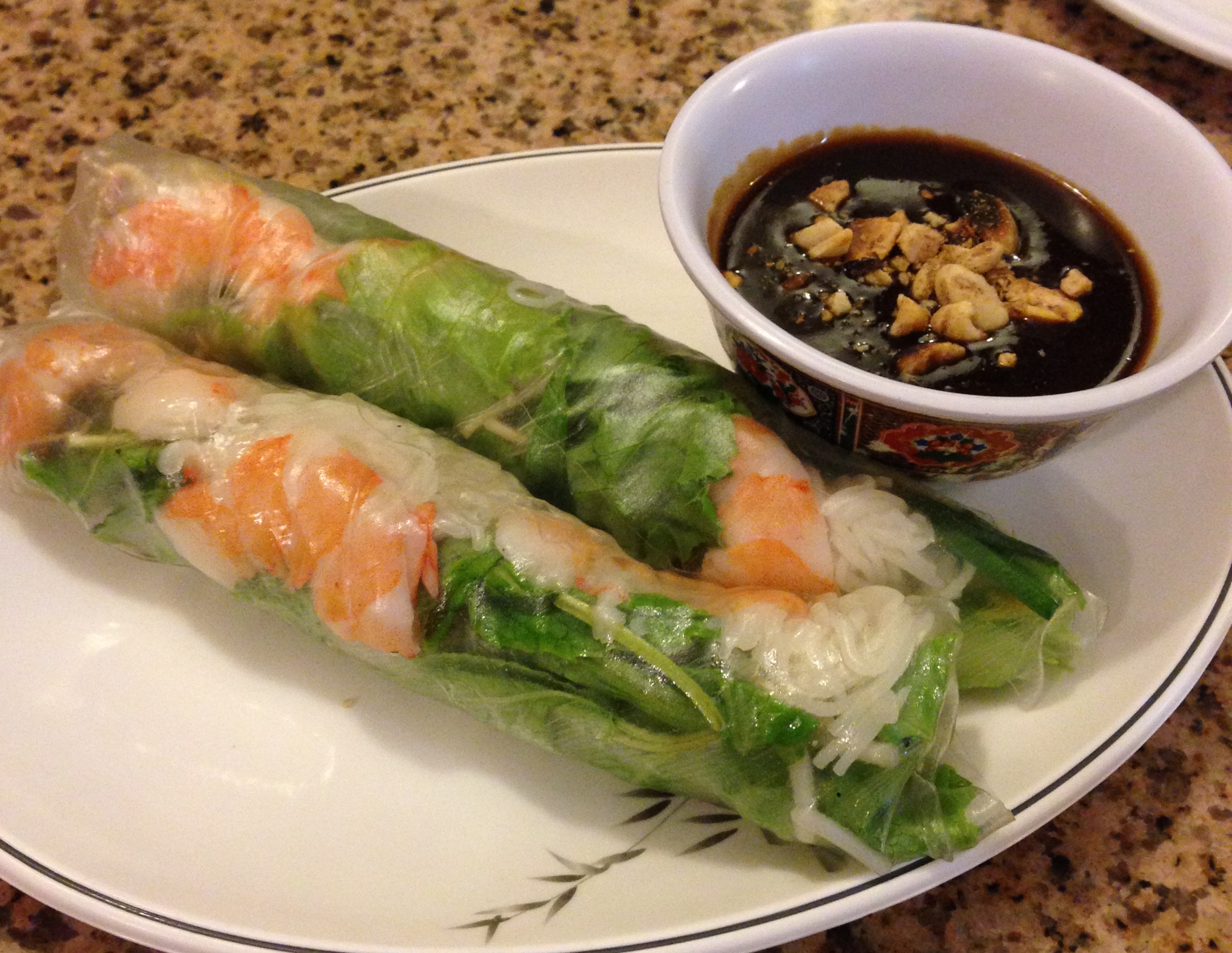After a bit of deliberation, we made our choices and waited for the food to come out. The first dish we sampled were the gỏi cuốn or “salad rolls” in English. They consisted of bún (vermicelli noodles), cooked shrimp, herbs, greens, and it was all wrapped up in bánh tráng (rice paper).