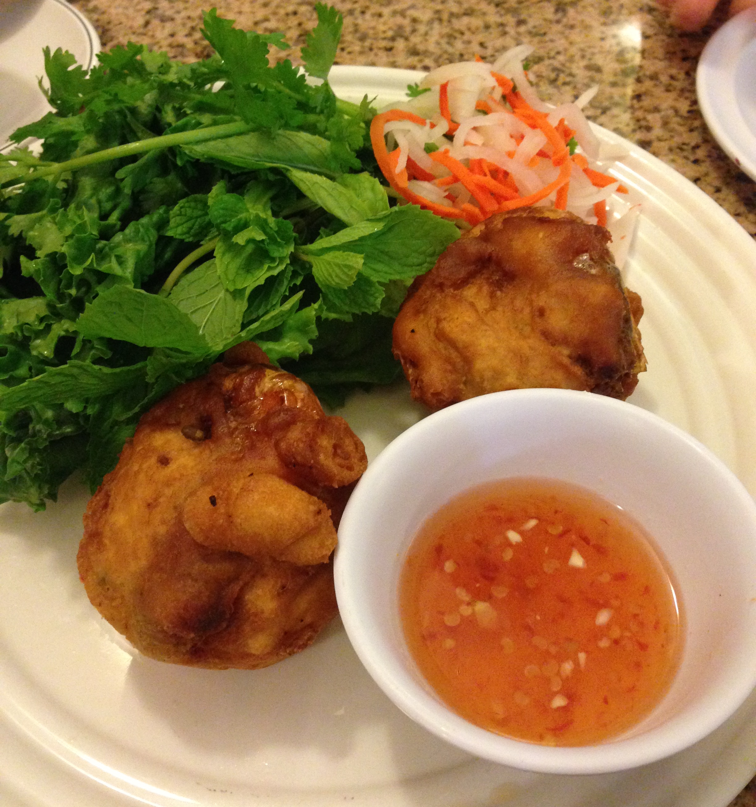 These rolls were served at room temperature and were a refreshing alternative to fried spring rolls that sometimes can be too greasy. The tương xào (hoisin sauce) that was served on the side had peanut pieces in it, but all of it put together was delectable. The sticky rice paper was strong enough to hold all of the ingredients within its insanely thin cocoon. Everything from the shrimp to the fresh cilantro and lemongrass made this dish really pop, and dipping the rolls in the sweet hoisin sauce blended well with the herbal notes from the vegetables. As for the vermicelli, it provided a much needed body to the rolls and a solid foundation for the house party that was happening in my mouth. The other appetizer we got, the fried shrimp balls, were quite the opposite experience.