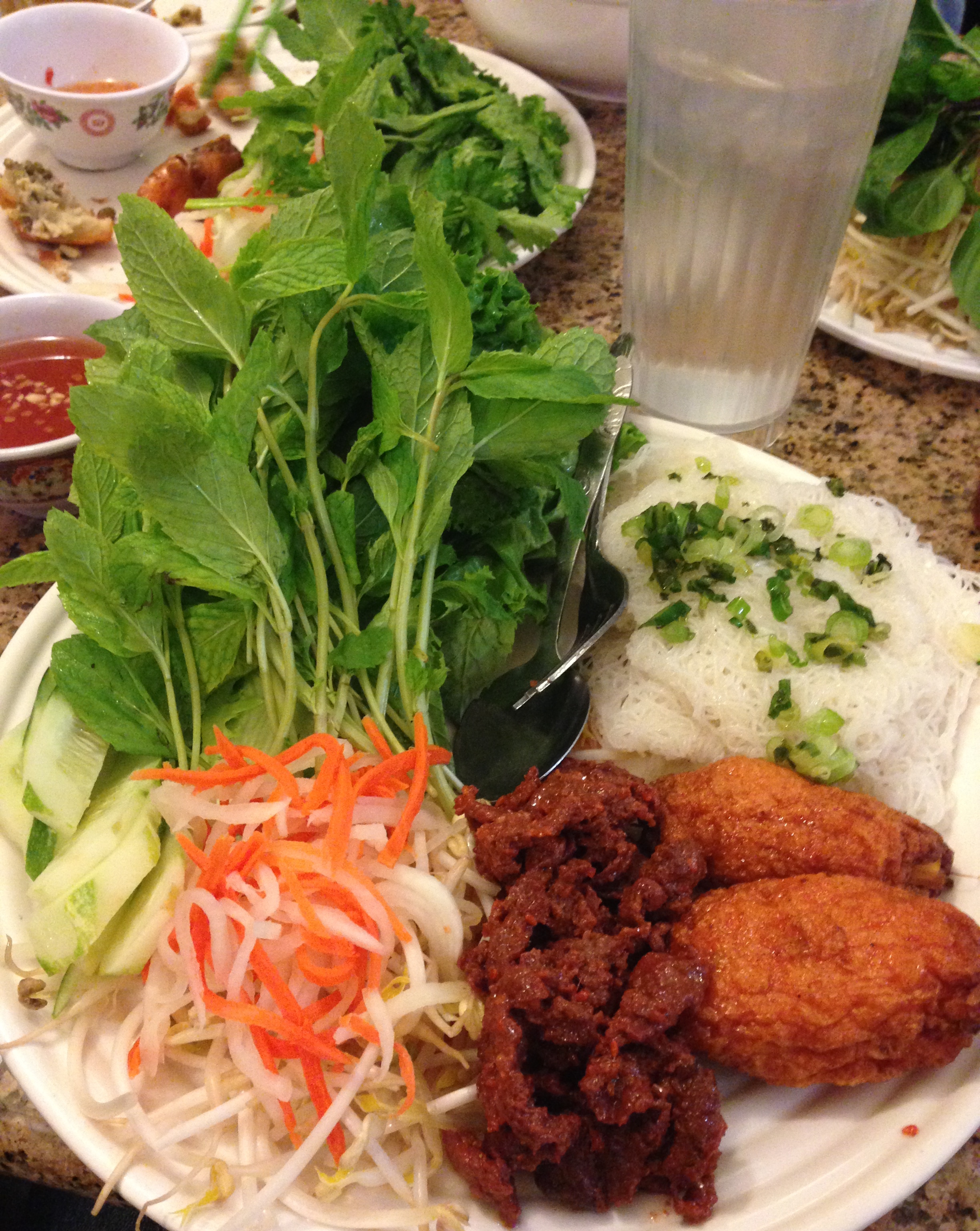 I don’t know what was inside them, but it was like eating pre-chewed eggs mixed with seafood with the consistency of cream cheese. I’ll just leave you with that image. On the plus side, my main course came out soon thereafter I tasted one of these horrid appetizers. I got the chả tôm (shrimp cake) and pork combo that was paired with more noodles, greens, pickled radish and carrot salad, fresh cucumbers, rice paper, and a bowl of warm water to make my own gỏi cuốn.