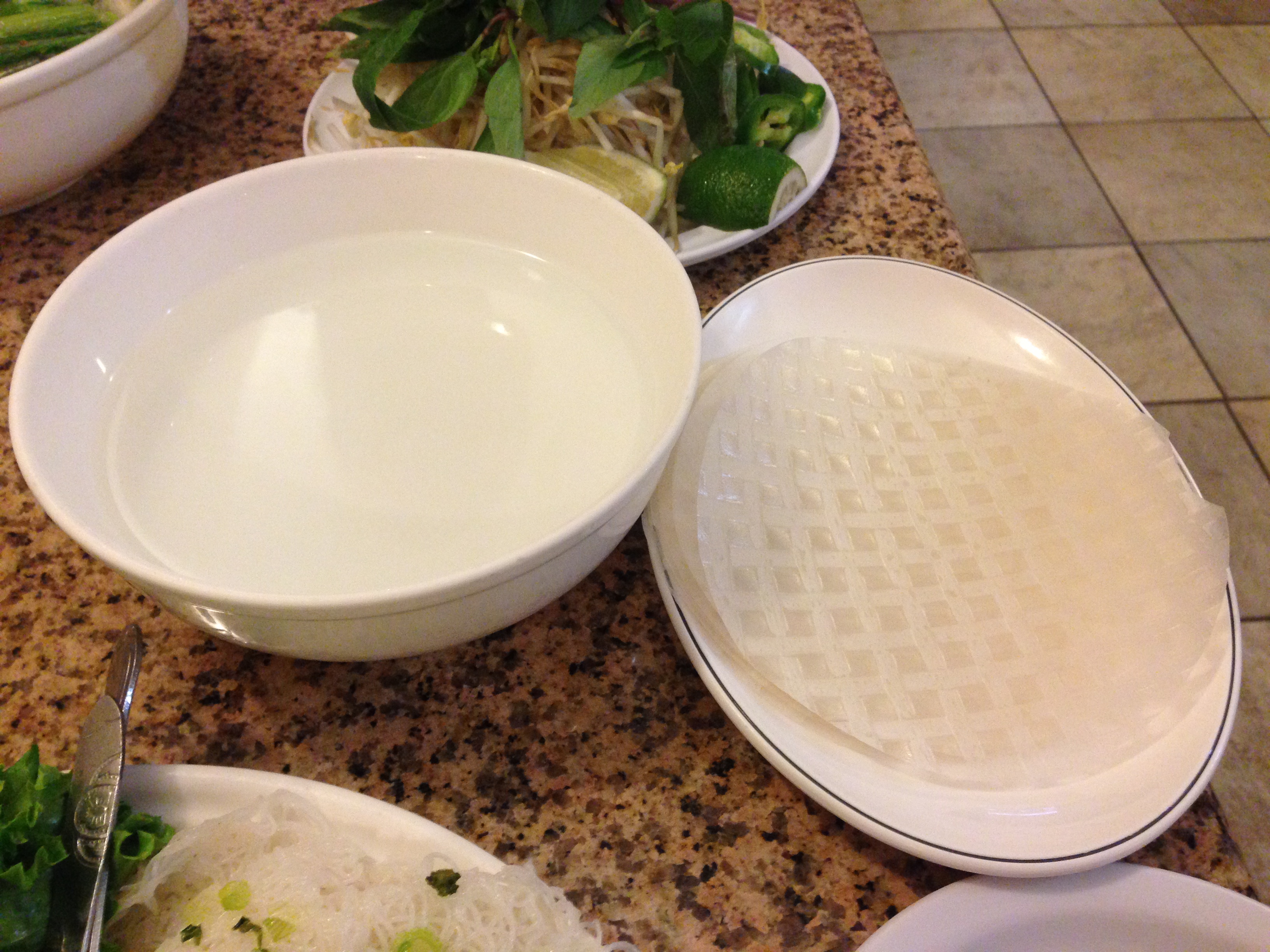 So, I focused more on eating the seasoned pork that was stir fried in a chili sauce that had plenty of personality to make up for the awkward shrimp cakes on my plate. So, I set to making my first Vietnamese spring roll. First, I had to take one of the rice paper disks and submerge it in the warm water.