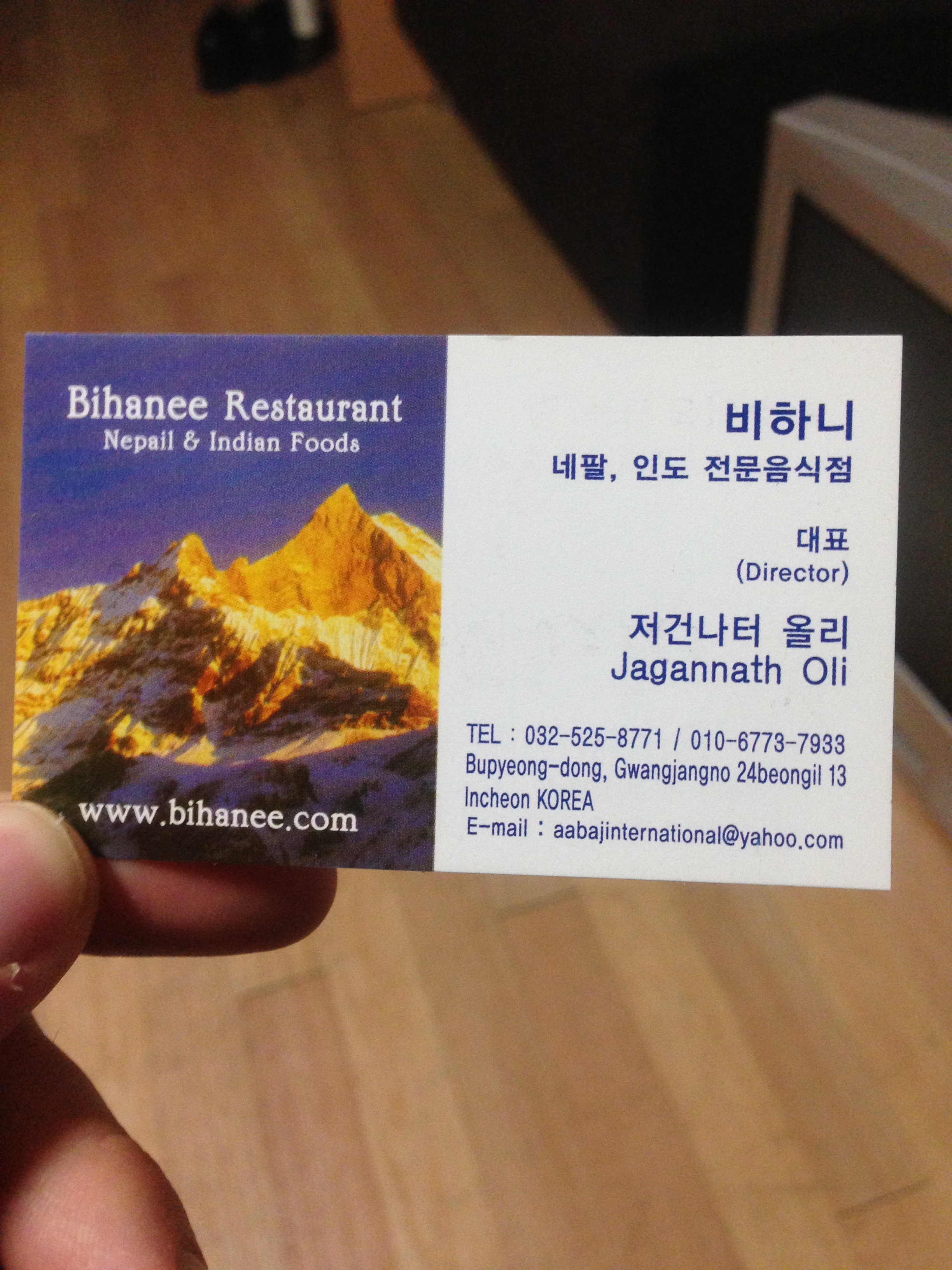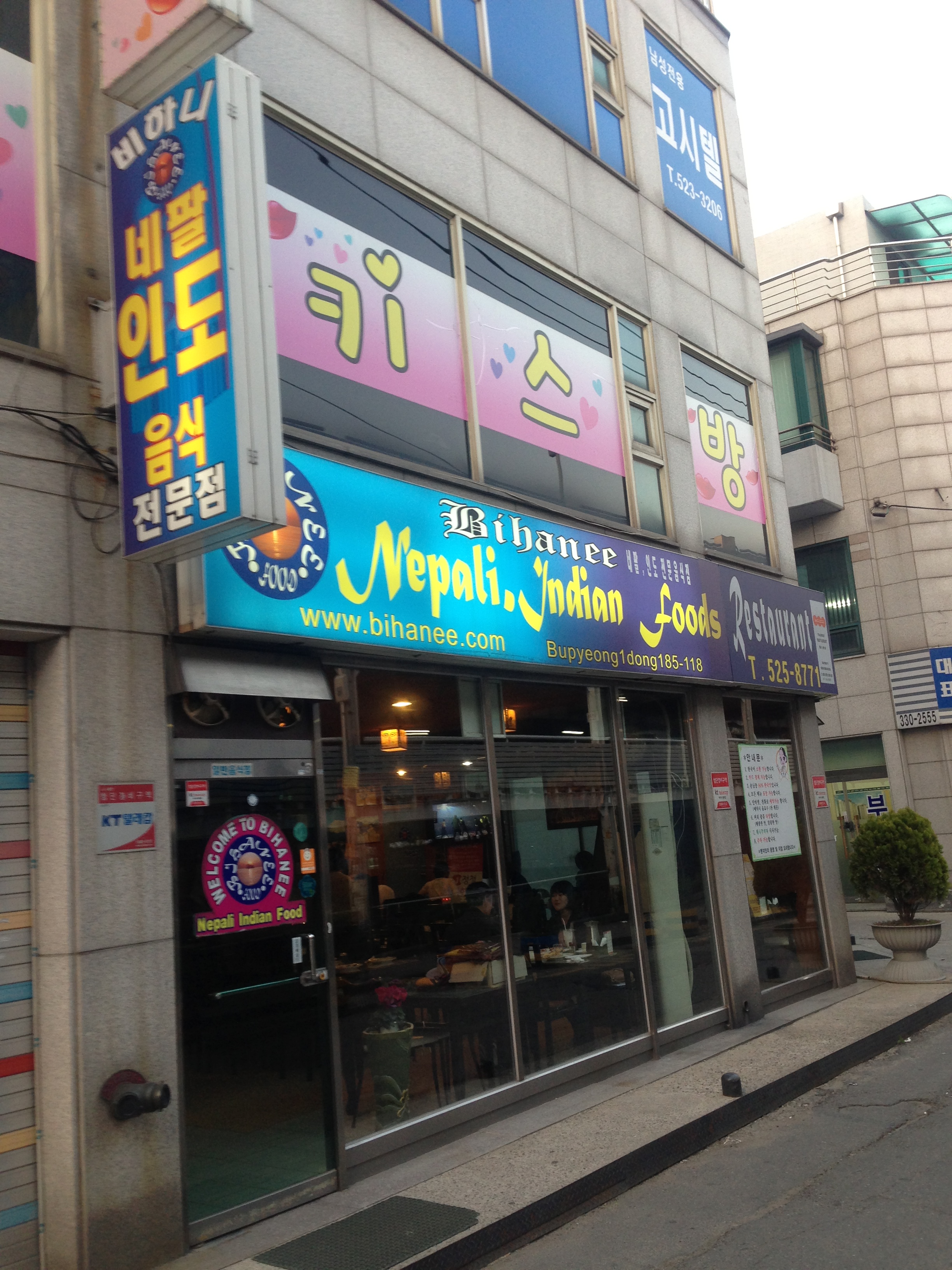 Hello everyone to another edition of Mastication Monologues! Even though the weather in Korea doesn’t know how to make up its mind, today was a beautiful day. So I went out for a mini-adventure in Incheon. I also wanted to find an interesting restaurant on the internet in Incheon, and eventually I landed on a cuisine that I never had before: Nepalese. The only things I really know about Nepal is its proximity to India, being home to the mysterious Yeti, and of course, Mt. Everest. The food? No clue. So after making my way to a local point of interest and hiking a mountain, I made my way to Bihanee Restaurant located right by Bupyeong Station in Incheon.