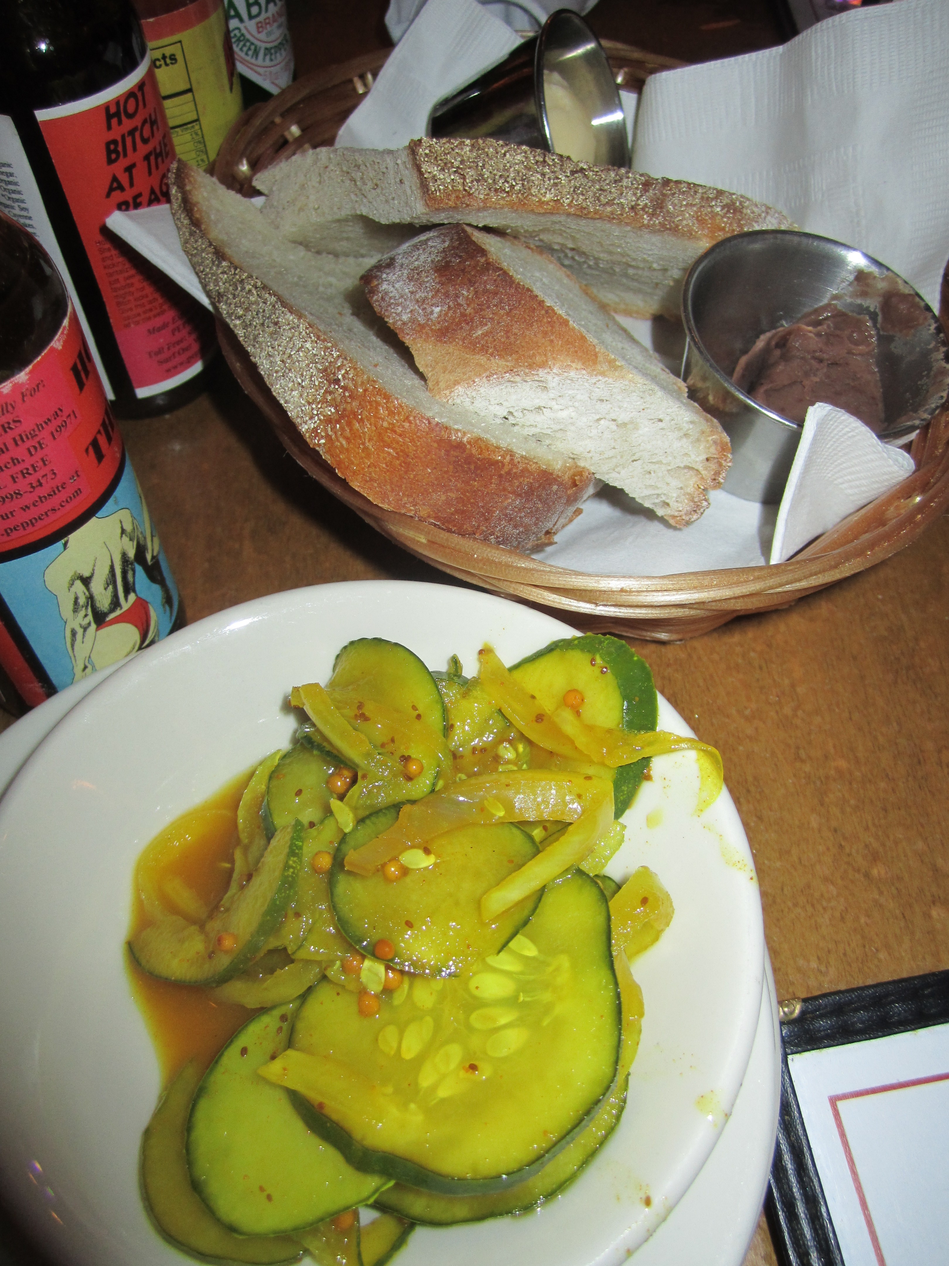 Along with the hot sauce bottles, we were also greeted with a free basket of sliced French bread. It was fresh but not warm, but the accompanying spreads were both new to me. One was honey butter which tasted like regular butter with a moderate sweet aftertaste, and the other spread was bean paste. It was a fitting savory compliment to its sweet predecessor, but I didn’t care for it much. The waitress also provided us with a side of free pickles with mustard seeds and onions. I preferred this hybrid salad over the bread because the cucumbers were not completely pickled and interacted with the semi-bitter mustard seeds to create an almost sweet aftertaste. It was a bizarre mix of textures and competing flavors that somehow worked.