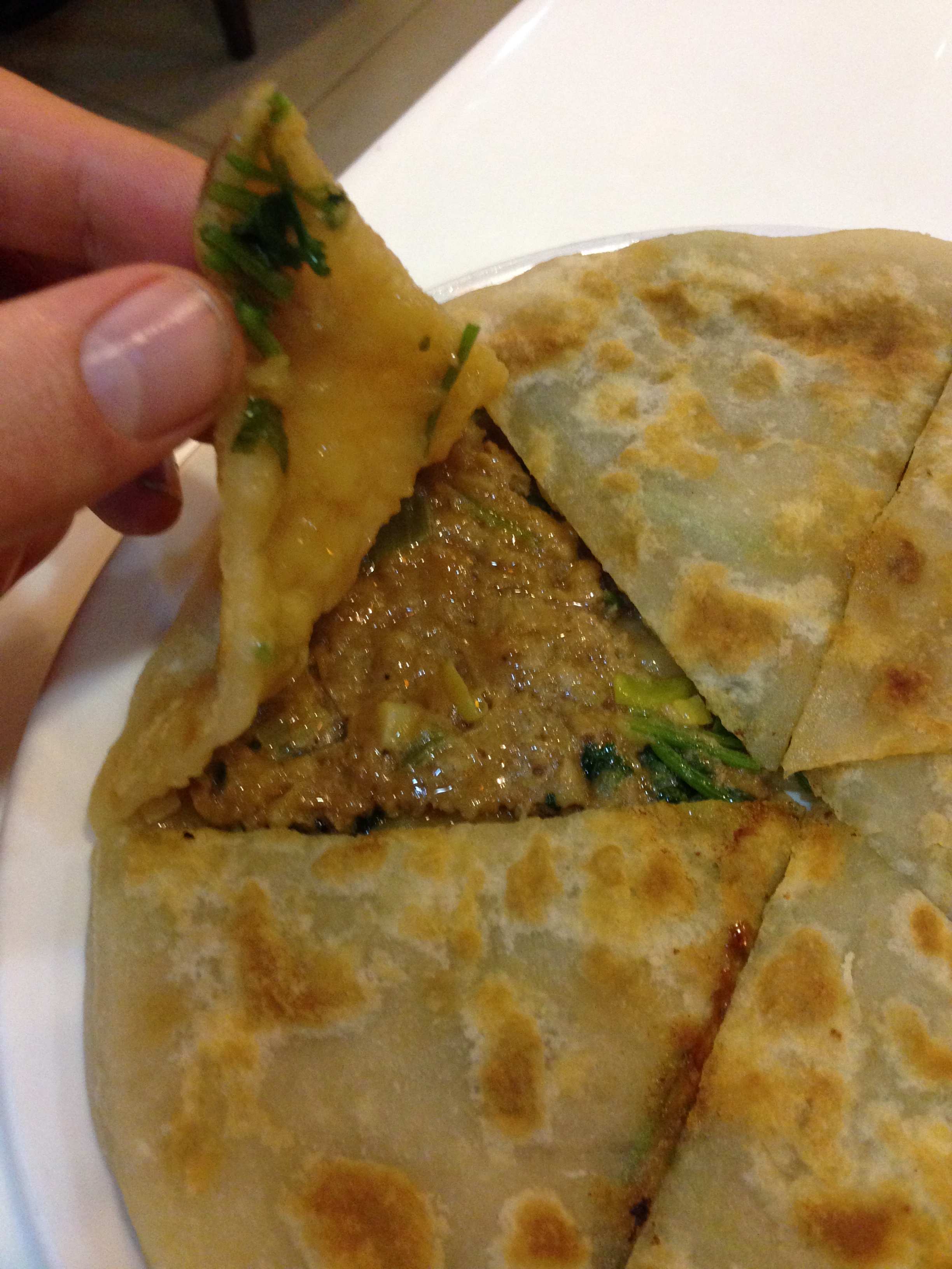 The dough was amazing. Soft and topped with green scallions, but the filling was kind of disappointing. I was expecting the red, sweet minced pork in all previous char siu dishes I’ve tried, but instead it was more like shreddednpork with little seasoning. I would still recommend trying them for the dough alone. Next up, the extremely lightly pan-fried jiaozi ( 鍋貼).