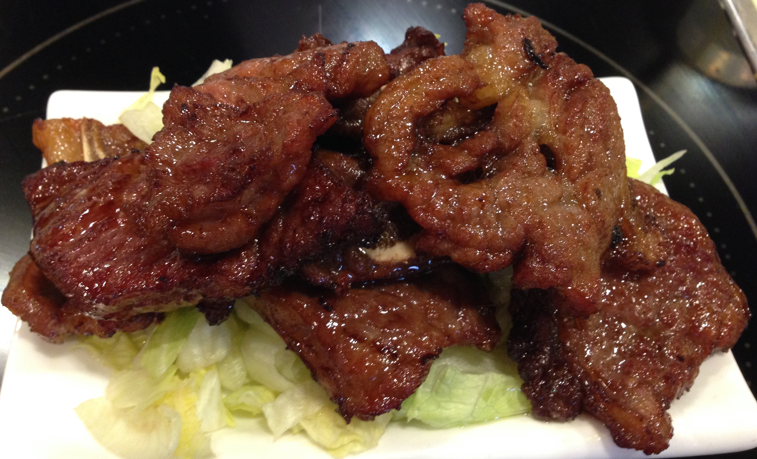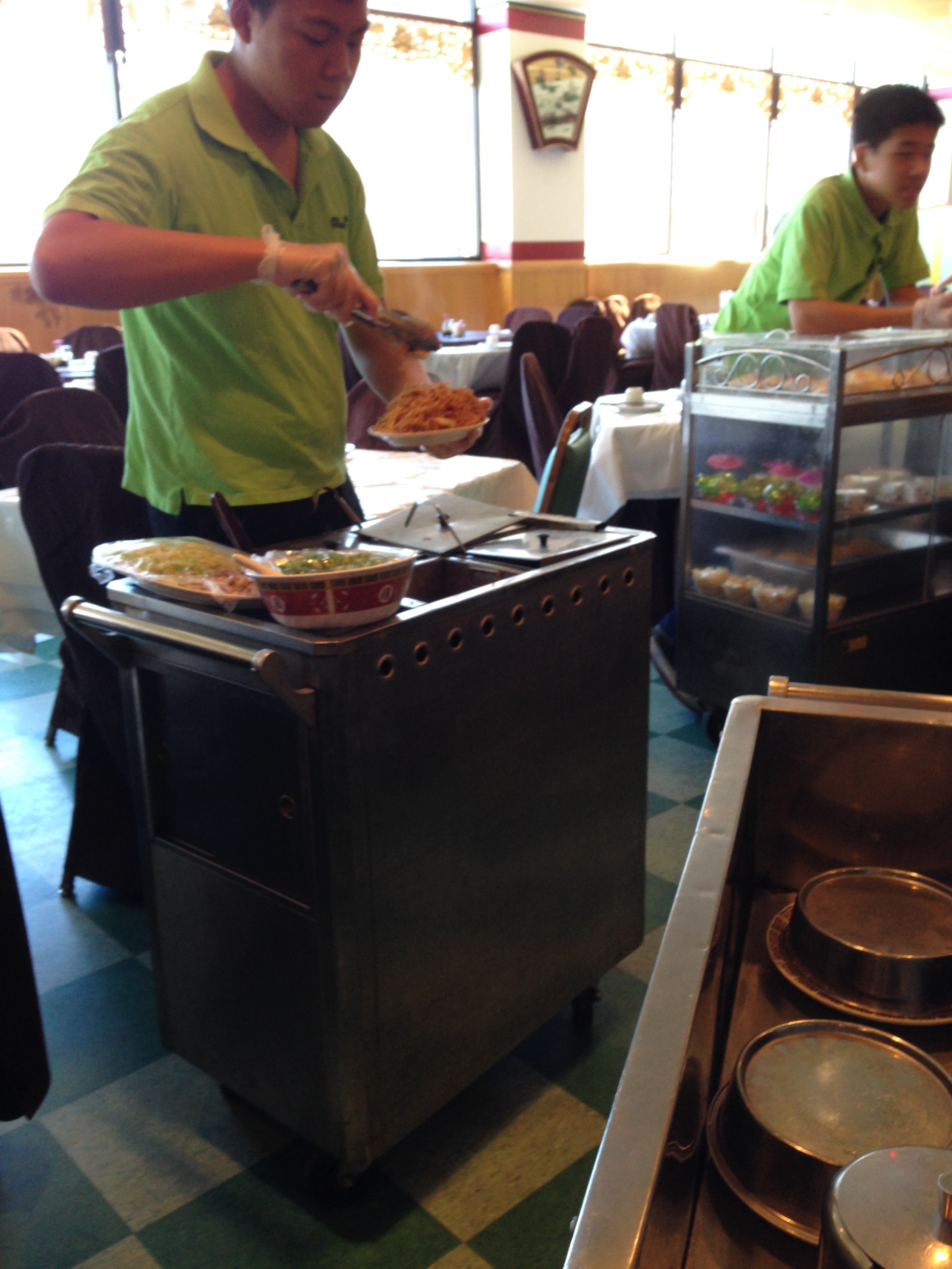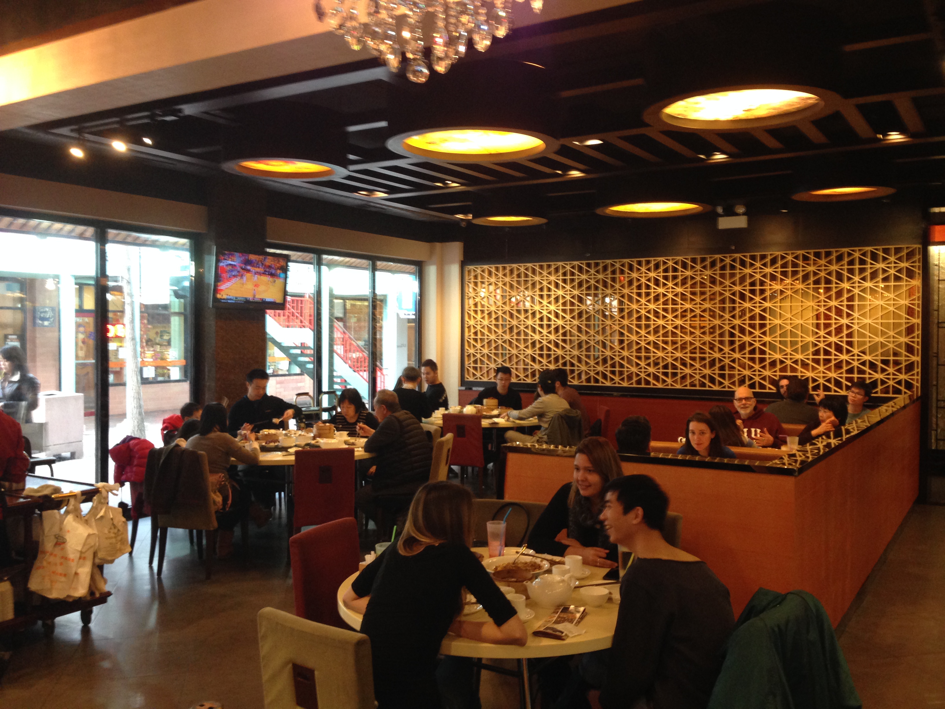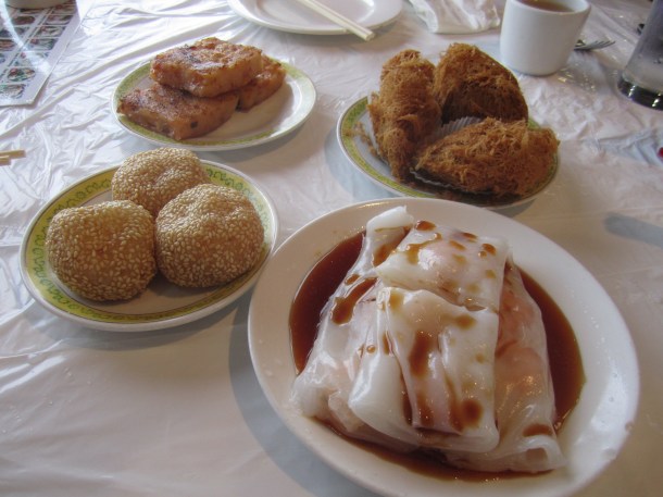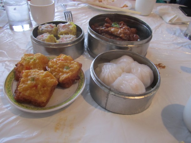 Chinese food has been around since the 1800s in the United States due to a high influx of Chinese immigrants to the West coast to build the railroads. Most of the workers came from southern regions of China, especially the town of Taisan (台山市), and brought with them food that had to be either adapted for their American customers or made as close to the real deal for their fellow Chinese immigrants without having all the necessary ingredients. Traditional Cantonese dishes do have some similarities to the modern day orange chickens and chop suey, but most mainland Chinese view American Chinese food as foreign food that their favorite tv characters eat out of white take-out boxes. Instead of heavily-sauced meat dishes, we started with char siu bao or pork buns. We got the baked version (叉燒餐包) which was different from the steamed type often served at many dim sum restaurants in Chinatown.