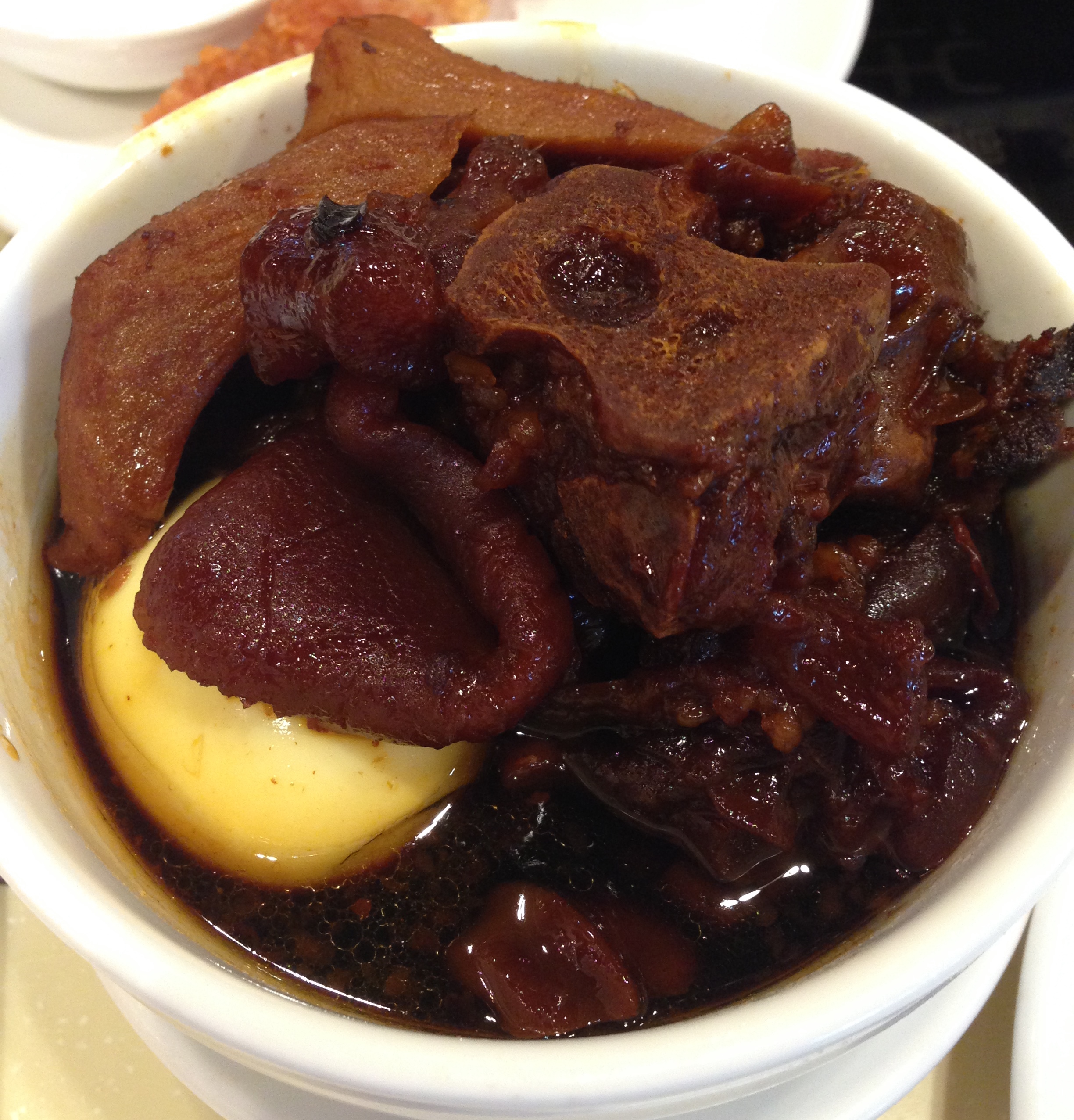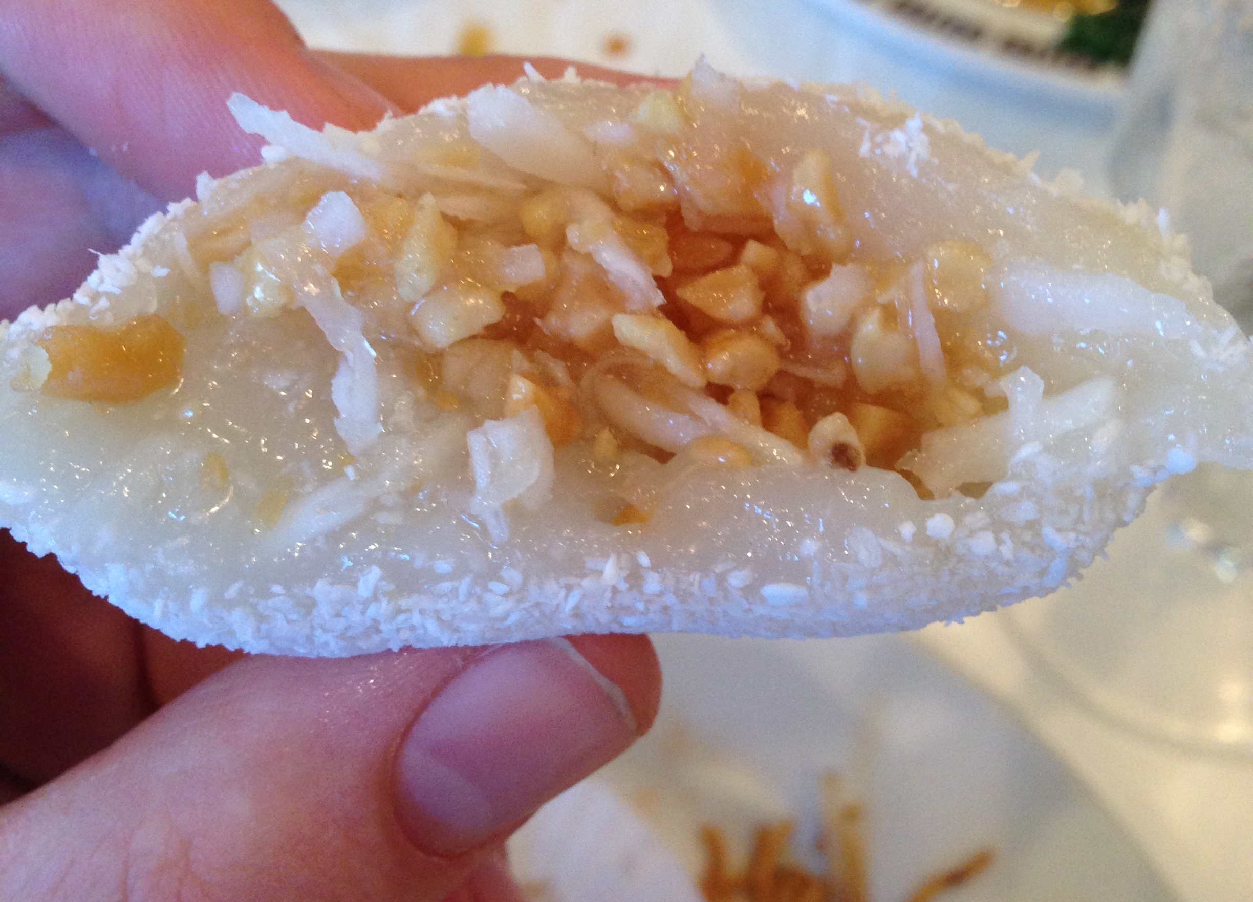 The name behind these dumplings come from many sources. Some believe it comes from the Chinese word for “horn” like on a bull, others the early word for “money”, or possibly the word “jiao’er” meaning “tender ears” because an ancient Traditional Chinese medicine practitioner made them for his patients who had frostbitten ears. No matter its origin story, it was a wonderful choice. They were filled with beef short rib and bone marrow whose saltiness was sinfully rich and filling. I highly recommend these dumplings. Then came the chiu chow fun gor which were shrimp dumplings that were showered with modestly sweet peanut-soy sauce and pickled red peppers.