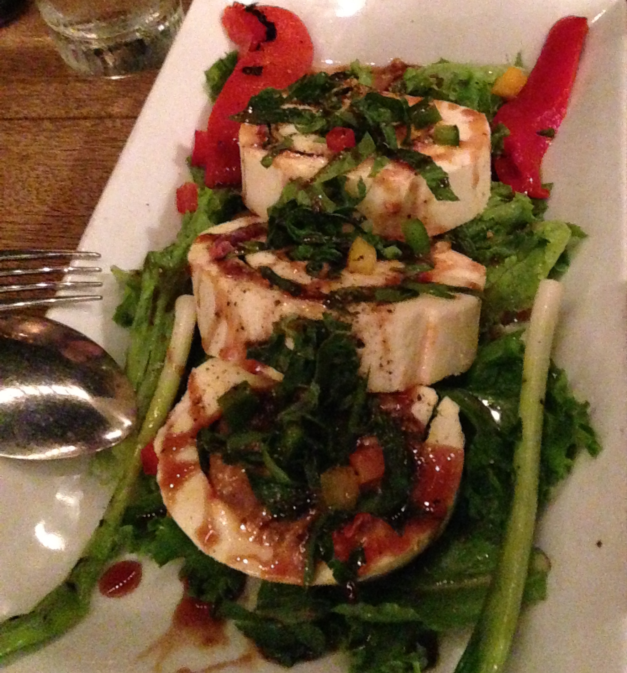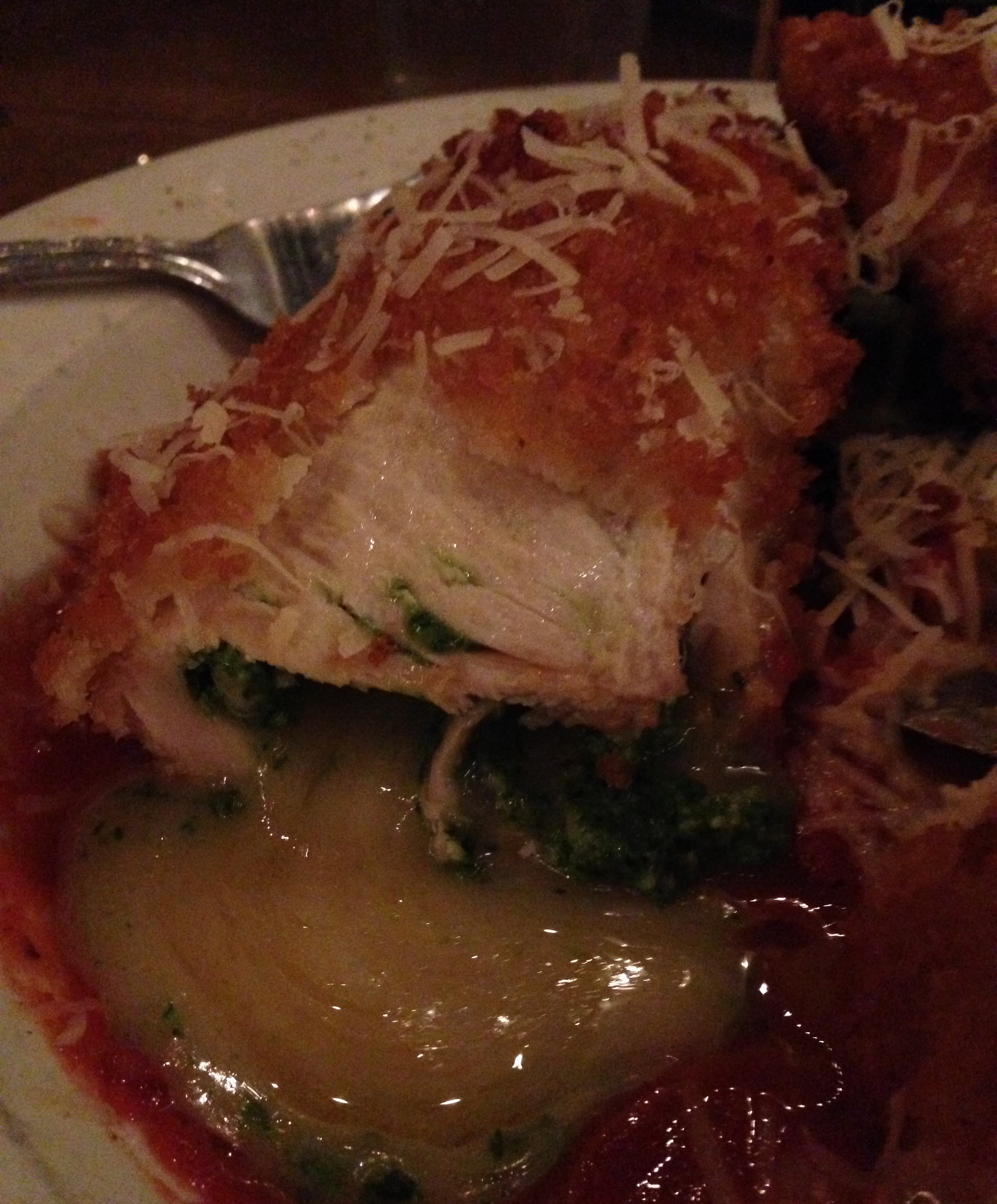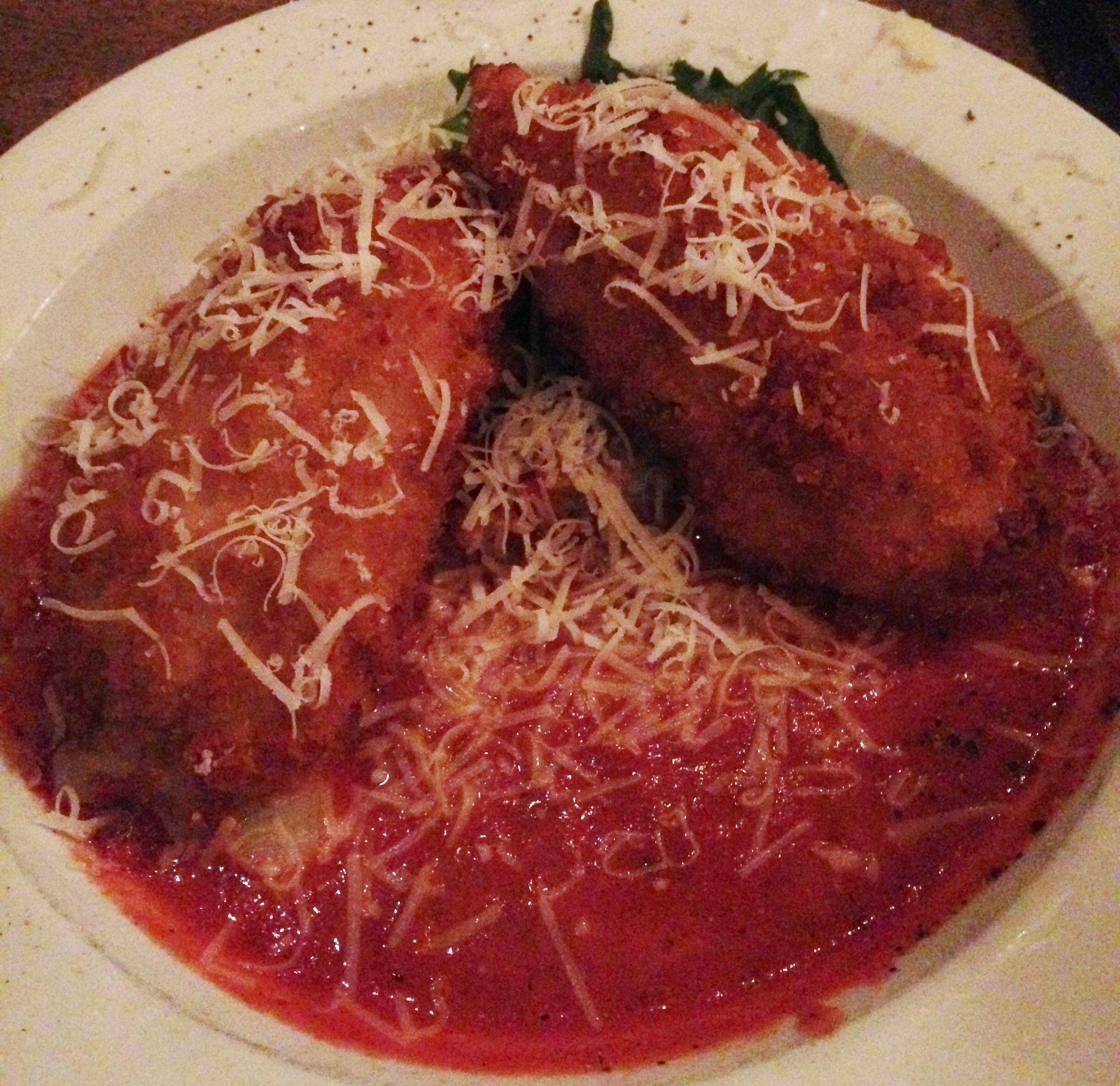 Chicago has a mountain of Italian eateries that run the gamut from bare bones like Bombacigno’s to high end dining like at RPM, so choosing one is an easy task.  However, finding one with high quality food at low low prices is often times a difficult task.  Enter the aforementioned Rose Angelis.  I had never heard of this place before I was being whisked away to it with my girlfriend for her bday din din with her girlfriends.  The outside was simple yet elegant, and the inside was just the same.  As we walked through the establishment, it was furnished with paintings of Italian landscapes and small white lights.  The Christmas light motif was continued outside on the patio which set the scene for the perfect date night if you’re looking to do one next year (let’s be real, there’s nothing romantic about eating outside in the middle of a Chicago winter).  They were strewn overhead from one end to the other as we took in the atmosphere and the menu.  After ordering a bottle of rose and chianti, we got an order of antipasti in the form of the melanzane miniature alla parmigiana ($7.95) and the caprese roll.IMG_4229 The former translated to inglese is just eggplant Parmigiana or bascially baked slices of eggplant topped with marinara sauce and fresh mozzarella cheese.  While there was plenty to go around, I personally wasn’t wowed by this dish.  It was mostly well done aside from the eggplant which I thought was kind of on the mushy side instead of being firm yet tender.IMG_4230 I was more of a fan of the caprese roll since it combined fresh and slightly chewy buffalo mozzarella that then contained molto thin pieces of salty prosciutto and topped with basil leaves and a tart vinaigrette.  Then for my entree I ordered the pollo Florentino (chicken Florentine) ($19.95).  This dish was the embodiment of the abbondanza Italian food culture, i.e. lots of food=lots of love.IMG_4231 The two hulking panko-coated chicken breasts were napping on a puffy bed of risotto surrounded by semi-spicy marinara sauce.  When I cut into these giant piece of poultry, the provolone and spinach flowed forth like a rich artery-clogging river of deliciousness.IMG_4232 It was quite decadent, and if you aren’t super hungry, don’t expect to finish this meal in one sitting.  You will need a doggie bag…or two.  However, even though it was a giant plate, that doesn’t mean that the quality suffered.  The chicken was high quality and the risotto was delectable when combined with the marinara that had more of a smoky flavor than spicy.  As if that wasn’t enough, since it was my girlfriend’s birthday, they brought out a slice of cheesecake to celebrate.IMG_4234 I had a tiny forkful, but it was molto bene, i.e. just the right amount of creamy and cool cheese with crumbly but firm cinnamon infused crust.