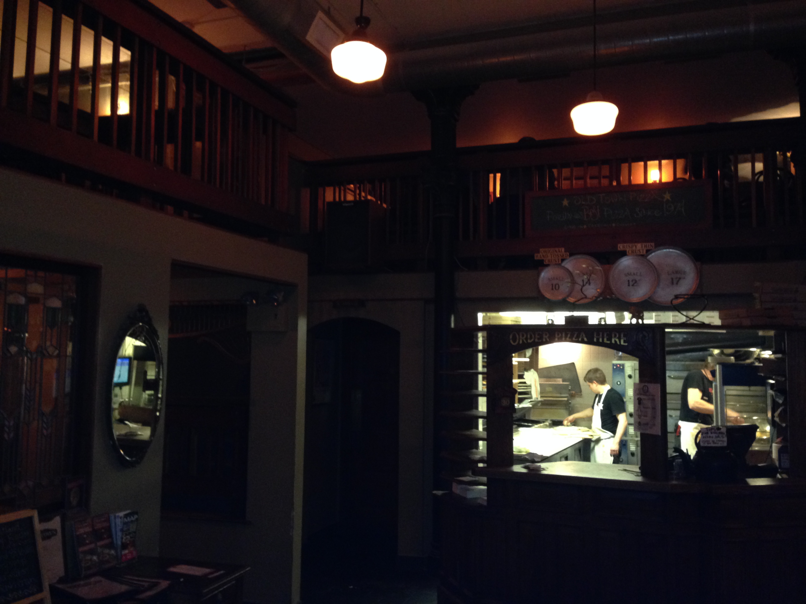 I put in my order of a small original house pizza which contained signature pepperoni, salami, mushrooms, olives, bell peppers and topped with house made sausage. . 10 inches for $14.50 is a little expensive for my taste, but then again I was on vacation in a haunted restaurant. They gave me a playing card with the two of diamonds on it as their way of keeping the orders straight, and it’s the only place in the world I’ve seen them do that. I then moved on to the bar next to the ordering booth where my hipster bartender hooked me up with an Old Joe Chocolate Dark Ale that was brewed at the Old Town Brewery.
