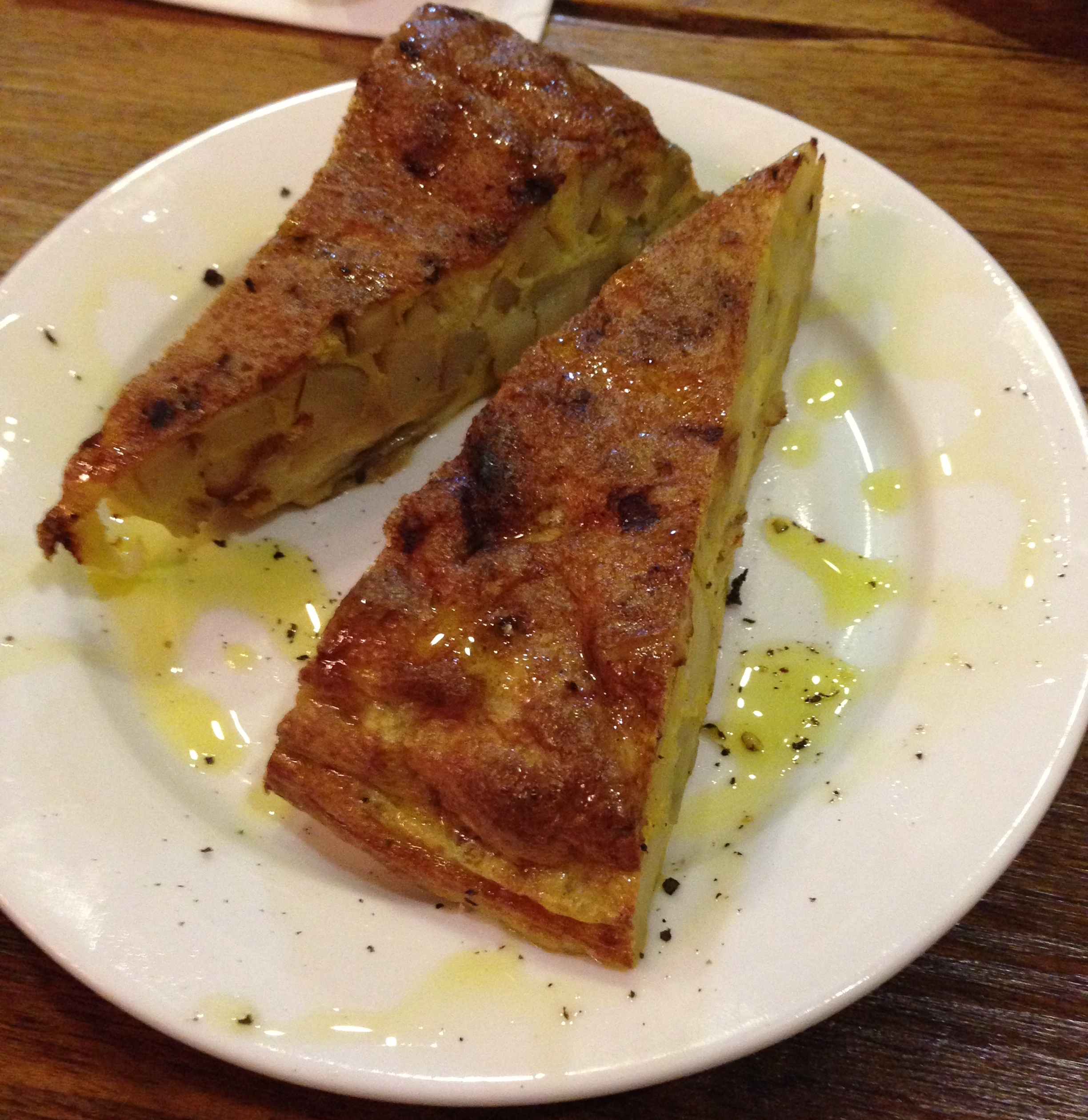 These hongos were garnished with a fried egg on the side which they told us to dip the pieces into, and there were some fresh dandelion greens on top along with some savory purple olives I enjoyed. Unfortunately, this was the only plate that wowed us, so it was somewhat depressing in hindsight to know that we reached the apex of the meal after one tapa. After the mushrooms came my nemesis in Spanish cuisine: la tortilla. Now, when most people hear the word, “tortilla” they automatically think that I was just munching on some flatbread instead of making a taco like a normal person. Of course I would hate it if I did that, but a tortilla in Spain is actually more like an omelet with potatoes inside. When I lived in Barcelona, I thought it was flavorless and nothing special. Que Tal tapas managed to recreate this signature blandness even more so by having a higher potato:egg ratio in comparison to the real thing.