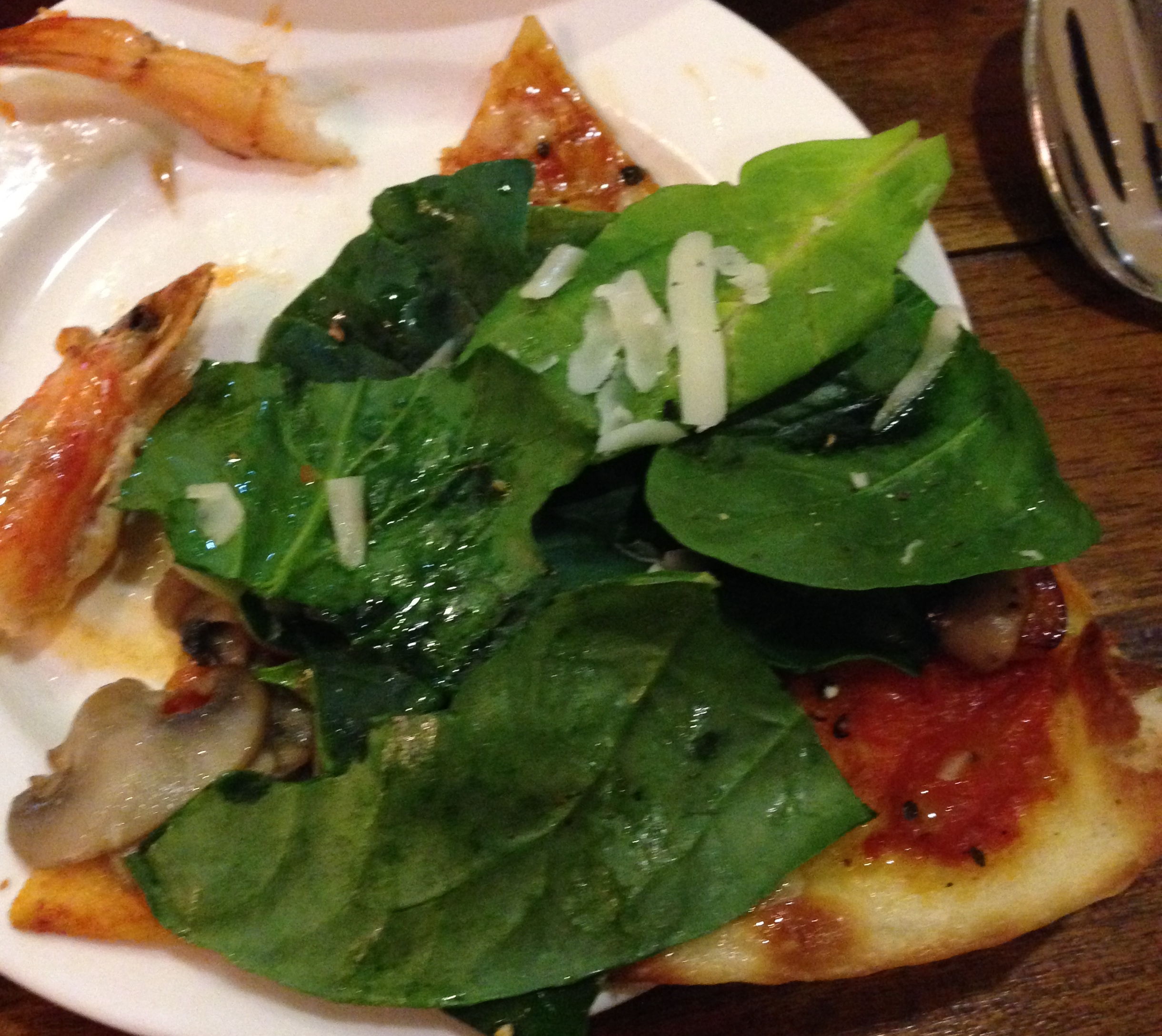 Our waitress then said to us, “Roll” while gesticulating towards the pizza. This was very disconcerting since I’ve never heard anyone tell me to roll my pizza. I could see why she said this when I went for a piece. It was incredibly thin, had no cheese, and was just mushrooms and the greens.