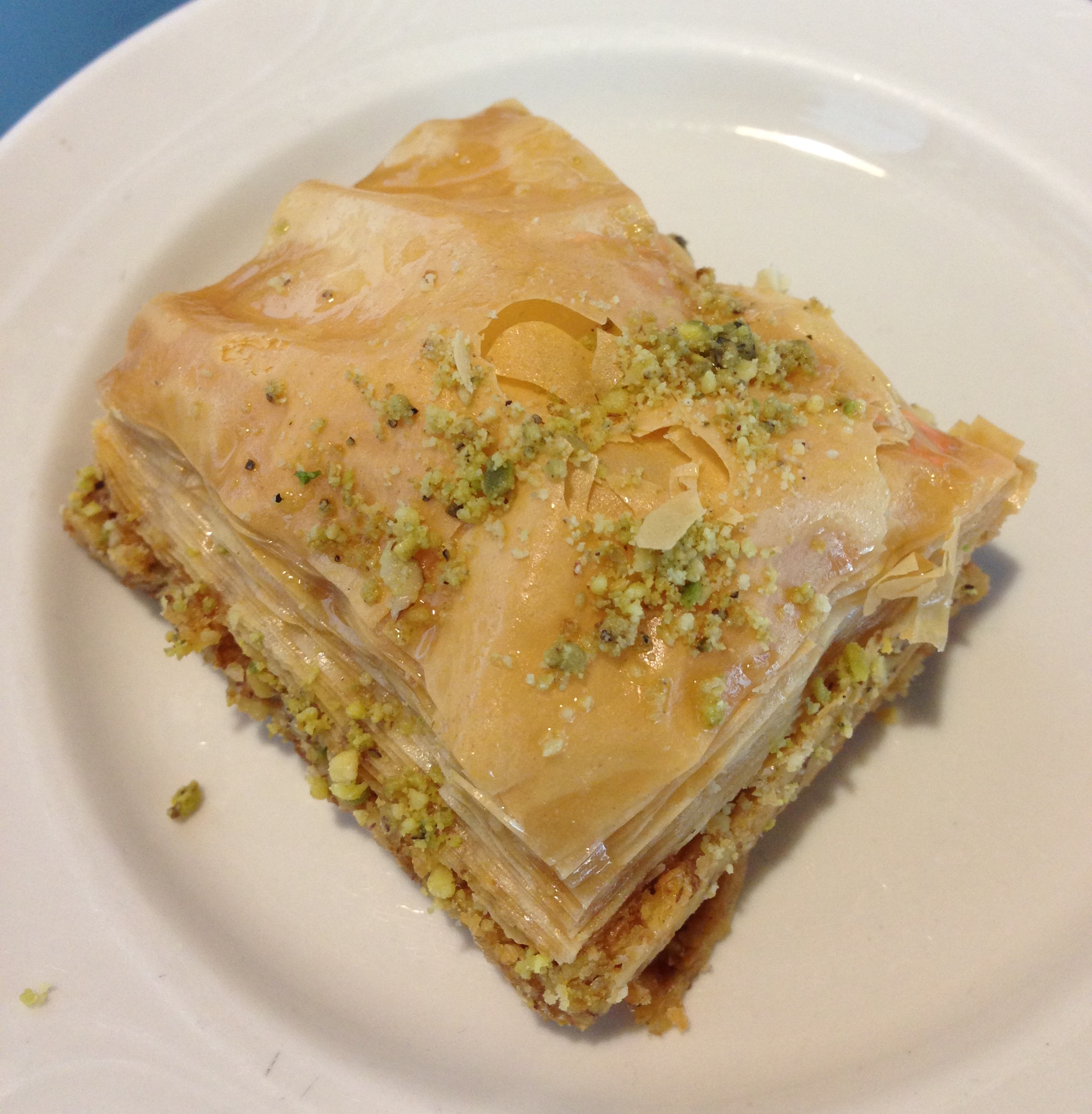 Babha ghanouj (بابا غنوج) literally means “pampered papa” in reference to most likely the head of a harem, and these flavors were definitely made for royalty.  It consists of grilled and pureed eggplant that is then mixed with sesame seeds, lemon juice, garlic, and yogurt.  It was also topped with a dollop of olive oil for good measure.  I found this cold spread to be both savory yet slightly tart that went very well with the light pita triangles that came with the dip.  I was more partial to the muthawama.  It was very similar to the babha ghanouj in terms of ingredients aside from replacing the eggplant with potatoes.  I think this switch made the white condiment feel more like sour cream and taste like a garlic aioli which goes great on any type of carb, be it pita or French fry.  As for my main dish, I passed over the tried and true favorites in my mind and took a dive into the great unknown with the mnazeleh ($10).  When it came out, I didn’t know what to think.  IMG_5655It wasn’t as sexy as the spreads I had before, but it looked more like an over spiced pile of onions and tomatoes.  The colors weren’t as bright either.  However, I made the mistake of judging a book by its cover.  It came with a more vibrant, complimentary side of rice that was moist and lightly seasoned that I subsequently folded into the main meal.  IMG_5654What I ended up experiencing was one of the best Middle Eastern dishes I’ve eaten.  The eggplant base that upheld the tomato, onion, and beef hodgepodge was super tender to the point of disintegrating faster than Subway’s ties with Jared and was infused with the beefy goodness residing above.  The addition of the rice gave it a lot more body, and I would suggest changing the recipe to include the rice.  I recommend this plate if you’re looking for something uniquely Syrian and full of flavor.  By the end of my meal, I thought I couldn’t fit anymore, but I had to try their baklava ($2.80).  This dessert’s history is as multilayered as its filo dough.  Different countries throughout the eastern Mediterranean claim it as their own invention, but there is no definitive answer for a dessert that is as old as time.  Some scholars believe it comes from the Mongols since it might derive from the root “bayla-” meaning “to pile up”, but the “-va” ending suggests a Persian origin.  The oldest recipe, dating back to the second century B.C., of anything resembling this sweet treat is the Roman placenta cake.  You might be thinking, “Ugh!  They made cake out of placenta?!!!  Vomitrocious!”  Au contraire, mon frere.  The word “placenta” derives from the Greek word “plakous” which related to layered breads and was then transferred into Latin as “placenta” as a word meaning “cake”.  However, the Roman version had cheese, honey, and bay leaves between each layer or “tracta” instead of the nuts we use now.  The modern version of baklava is thought to have derived from Istanbul during the reign of the Ottomans where the sultan would present his elite guard, the Janissaries, with trays of baklava on the 15th day of Ramadan in a procession complete with pomp and circumstance.  At Pita Pita Grill, I was neither a Christian mercenary nor served with any great ceremony.