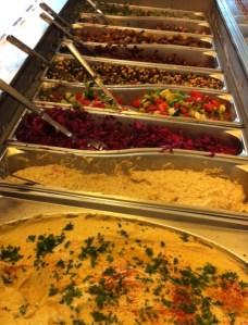 Now, I’ve had my fair share of Middle Eastern/Mediterranean food with gyros, baklava, doner kebab, and dolma etc. all over the US/Europe, so I was wondering how good this place could be when my friend described it as a place where you create and garnish your own falafel. All I kept on thinking of was some sort of Middle Eastern Fuddruckers, but I highly doubted they would have one pound falafels for me to tackle in a demonstration of my gastronomic might. So I decided to visit to see what all of the hubbub was, and I was immediately greeted with free samples outside of the door. I took the traditional falafel sample which was coated in a typical yogurt based cucumber sauce. The falafel itself was quite crisp and flavorful with a crumbly, chickpea-based interior that was packed with spice and herbs. However, I ended up getting the curry falafel which was made of lentils instead of the traditional chickpea falafel I sampled at the door. When they brought it out to me at the same counter I ordered it at, I was surprised at how large they were as they lay there in the gaping maw of the pita bread that looked more substantial than a traditional unleavened pocket. With our falafel bread mini-baskets in hand, we got down to business at the “mezza bar” that contained literally a bevy of sauces (babaganouge, hummus, jalapeno and cilantro, harissa, tzatziki, garlic), tabbouleh, and plenty of pickled vegetables like beets and peppers among many other garnishes.