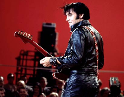 At first glance, my Elvis french toast looked like his ’68 return special when he was rejuvenated through the use of black leather and sweet sideburns kind of like this: