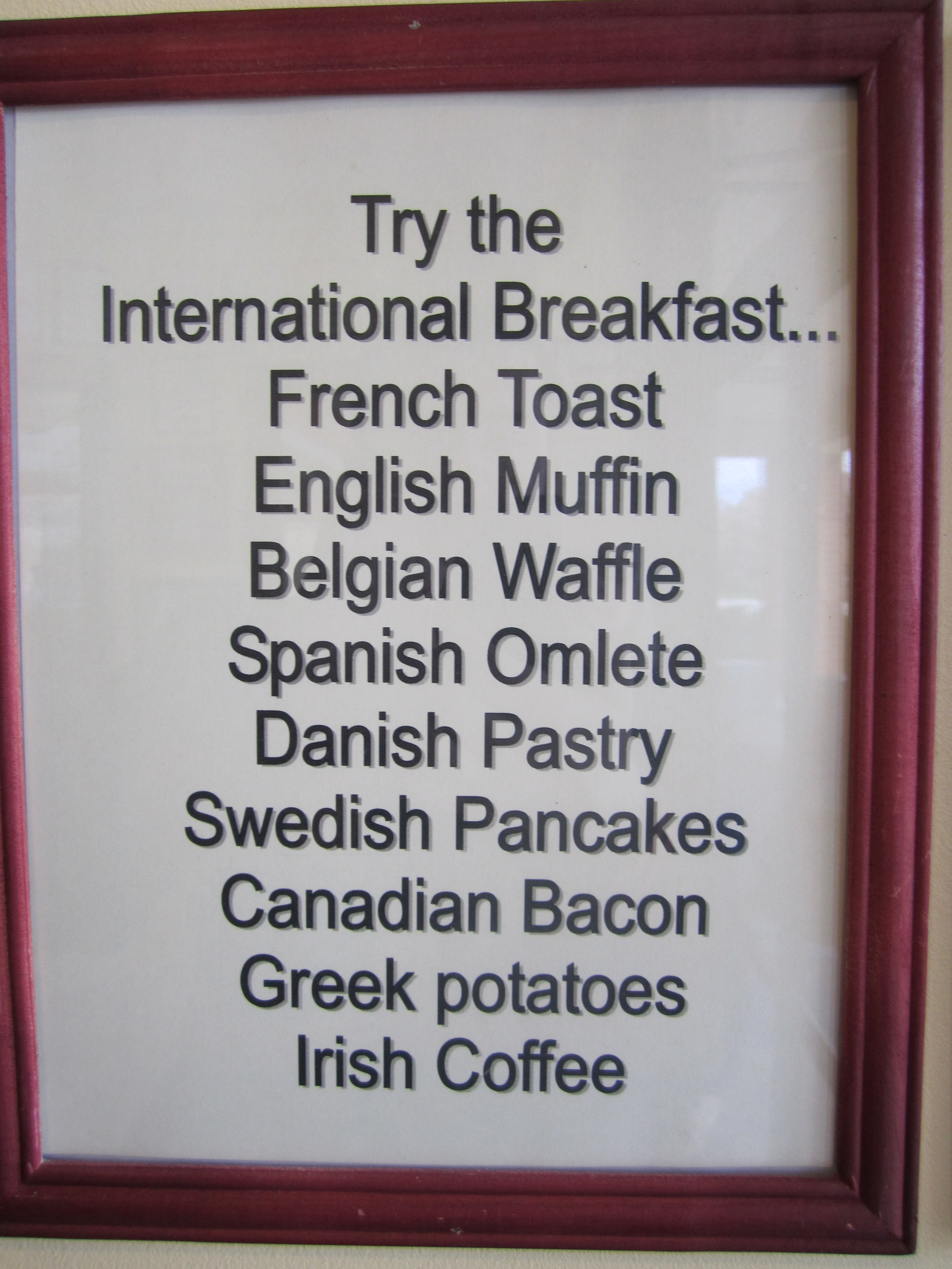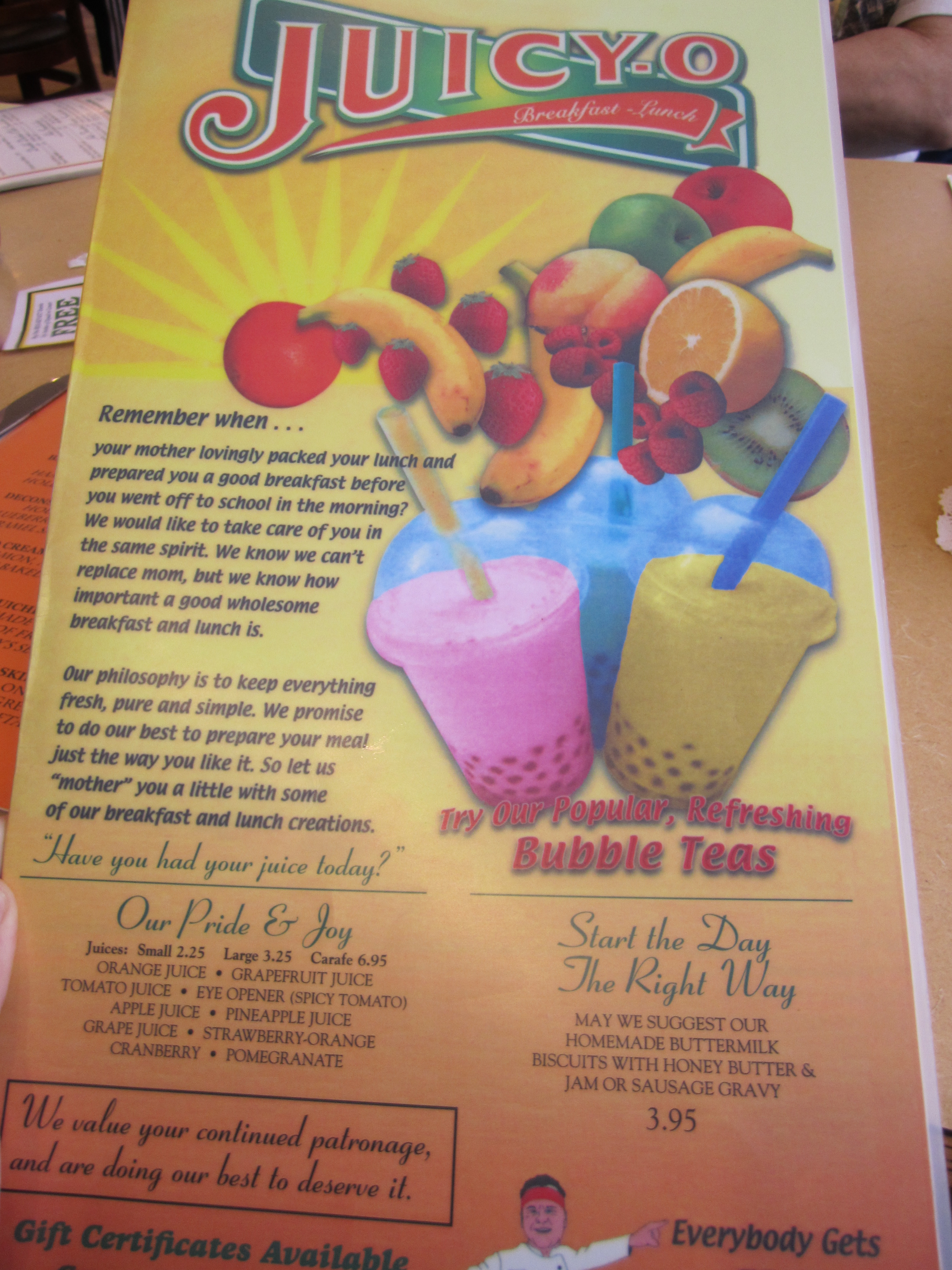 To begin, why exactly is this restaurant named, “Juicy O”? I soon found out when I walked into the door with their walls that are covered in small picture frames containing comical pictures about the importance of enjoying a good breakfast in a society that seems to be even more fast paced with each passing year. It also gave off a vibe of being more along the lines of an old-fashioned diner that prides itself in its freshly squeezed O.J. (that’s orange juice= the Juicy O in question), I’m not talking about the other type that tries to run away in a white Bronco haha). I digress, here is an example of their homely wisdom about the universality of breakfast and the integration of various cuisines: