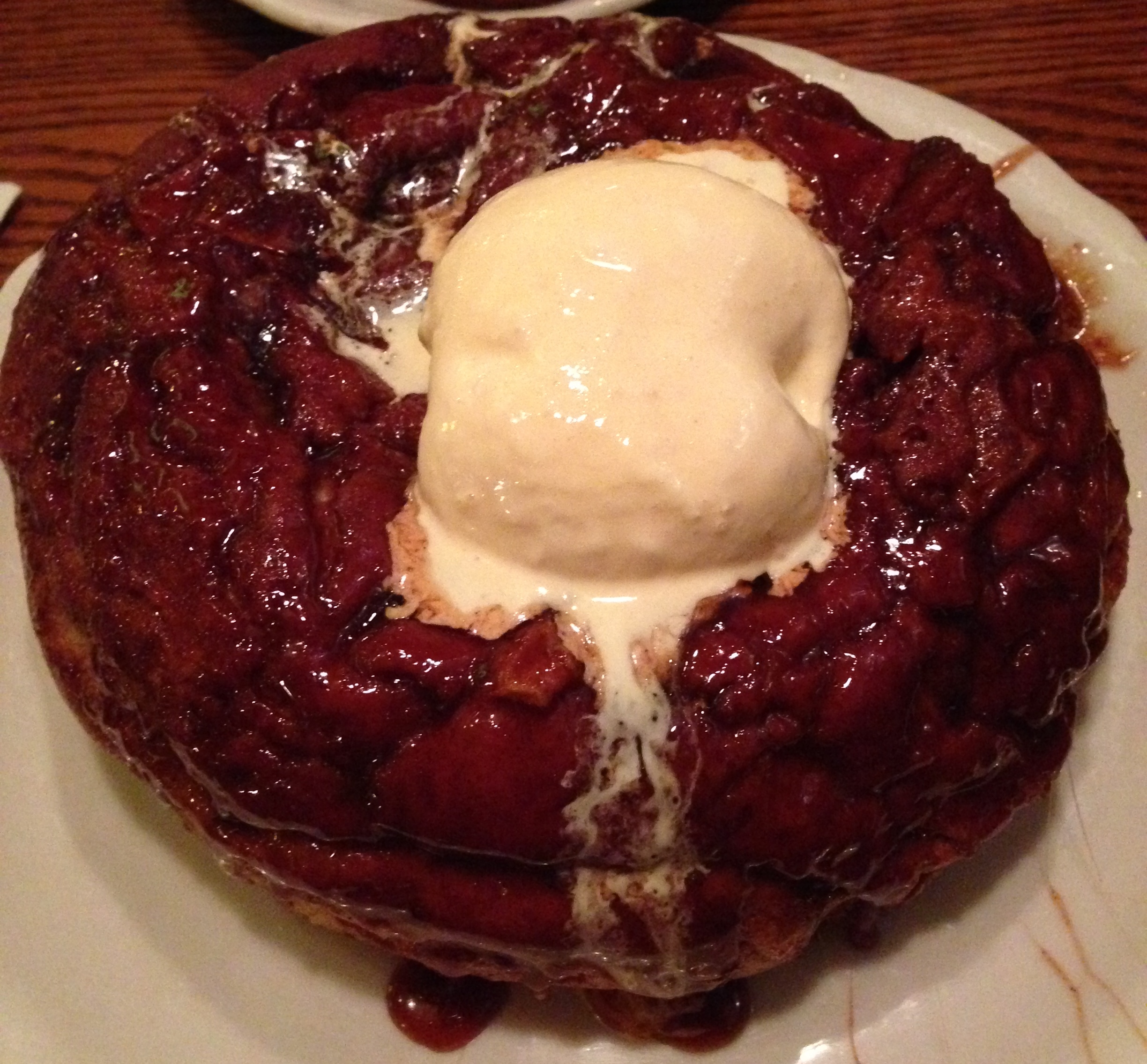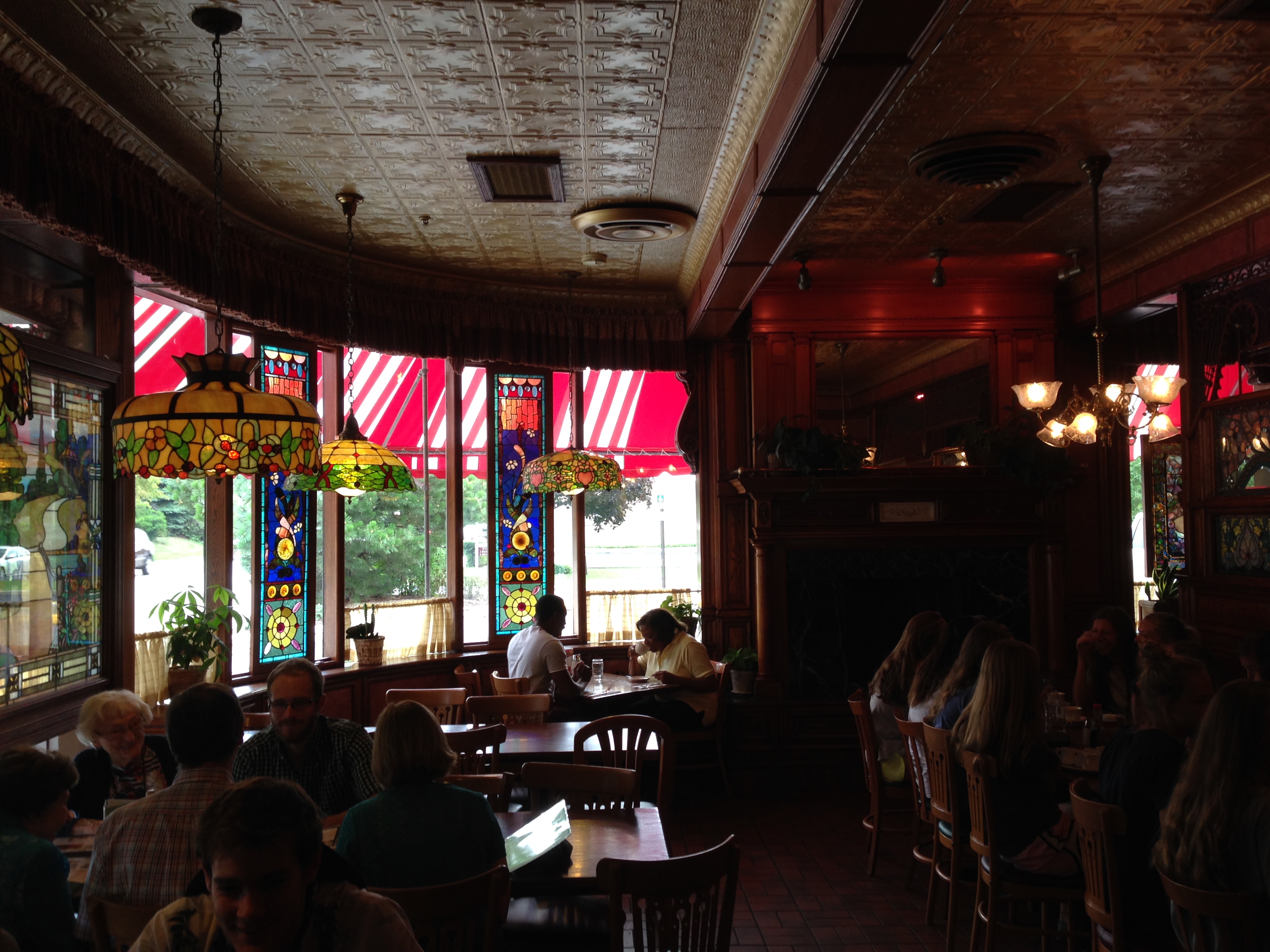 I’ve heard of the Walker’s Bros. before, and I wondered what made them so special compared to all of the other types of chain breakfast restaurants or even little hole in the walls I’ve visited in the past.  Breakfasts in America are much more varied compared to breakfasts in other countries, so I feel like I’ve seen it all when it comes to ordering something tasty to fill my piehole with in the morning.  Boy, was I wrong after eating with the Bros.  The exterior of the restaurant just radiated history like it was a living time capsule, but the cars were slightly less hulking and more chock full o’ plastic compared to the motorcoaches of yesteryear.IMG_4201 Walking through the door, however, that hasn’t changed since they first opened it (or so it seemed).  It was full of beautiful stained glass windows and ornate woodcarvings coating the walls.IMG_4200 We were promptly seated in one of the side dining rooms, and we were treated to a perfect view of one of the enormous ceiling lights that were designed in the Tiffany style.IMG_4193 Not only were we taking in the surroundings but also the menu contents.  Janice had been here before, so she automatically knew what she was going to get:  the Dutch Baby pancake ($8.50).  As for me, I was having trouble trying to pick something since everything looked great!  Eggs?  French toast? Crepes?  Waffles?  I was at the pancake house, so I plumped for the apple pancake ($9.95) with the additional $1.95 for French vanilla ice cream on top.  Got to do it big when you’re rollin’ with the Bros.