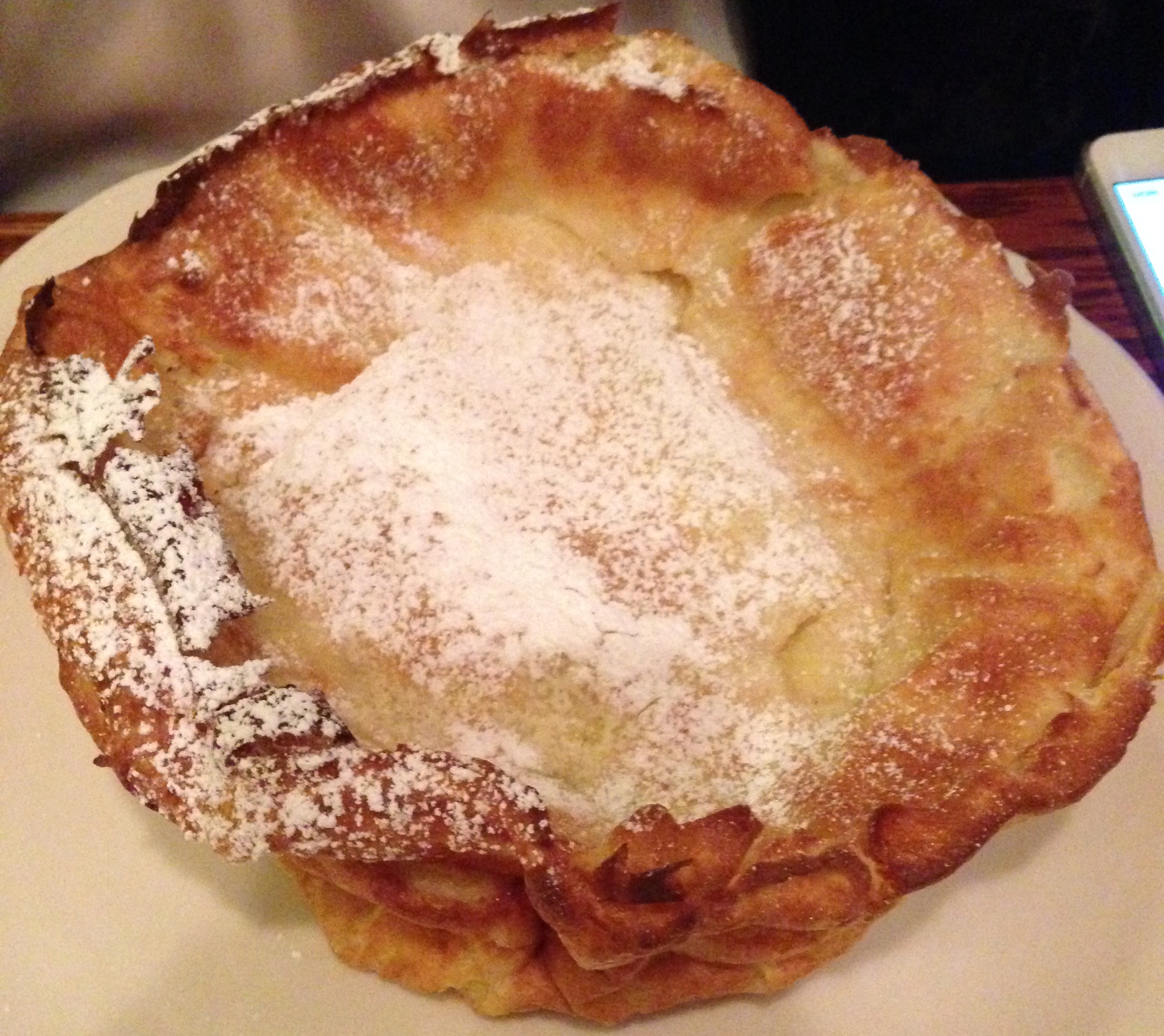 When our plates came out, I was taken aback since I had never seen anything like it.  Janice’s Dutch Baby wasn’t like a small, screeching, blonde child wearing wooden shoes but rather something that looked like a cross between a taco salad shell and a danish.IMG_4198 What it actually was was an oven-baked pancake that was topped with a healthy sprinkling of powdered sugar.IMG_4197 The kicker was the lemon juice she spritzed over the pancake that really brought it to life.  I personally thought that it was a unique dish as it was less like a bready pancake and more like a lighter, buttery crepe that sizzled over my palate with the sweet powdered sugar combining with the raw sour power of the lemon juice.  Thankfully, the pancake itself wasn’t outshone by the lemon juice.  Then there was the apple pancake….where to start?IMG_4199 It was advertised as an “Original Pancake House tradition”, and that it was stuffed with some apples and cinnamon glaze.  Simple.  I’ve had apple pancakes before where they slice some apples on top and put a slightly thicker syrup over the flapjacks and fruit to leave you full but just moderately satisfied.  My apple pancake from Walker Bros. was the Steve Jobs of the breakfast world.  A revolutionary just doing what it wants to do no matter what.  It’s not for the faint of heart but rather for those with a well endowed sweet tooth, i.e. yours truly.  The exterior seemed to be lacquered with the Sinikiang (fun fact:  Sinikiang or Xinjiang is the Northwestern province of China that is home to the Uighur community and a majority of China’s Muslim minorities.  Also, it was a stop along the famed Silk Road where spices like cinnamon were traded.) cinnamon and sugar glaze so that it shimmered under the ornate lights and beckoned me to tuck into it.IMG_4196 I could see that it was piping hot as its snow white toupee was slowly trickling down its undulating surface through each nook and cranny.  Upon slicing it open, I was greeted with slices of cinnamon apples, pure white dough and more sugar glaze.  It was like an apple pie and a cinnamon roll had a delectable love child.  I was in absolute heaven with every bite, and this is one tradition I hope Walker Bros. never retires.