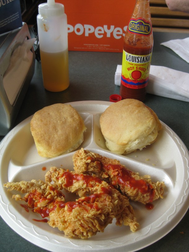 Howdy y’all! It’s time for another edition of Mastication Monologues. Today I am going to be writing about a certain restaurant chain that has a special, deep-fried spot in my heart (and no I’m not talking about Atherosclerosis) but rather that golden brown, Cajun breading that comes on Popeye’s’ Chicken. My favorite Popeye’s is located at 5711 S. LaGrange Road in Countryside IL. There is a closer location on Cass Ave., but I no longer patronize that location due to its lackluster biscuits that are more akin to hardtack than buttermilk pillows, and a bout of food poisoning they served to me with a side of bland chicken. But I digress.