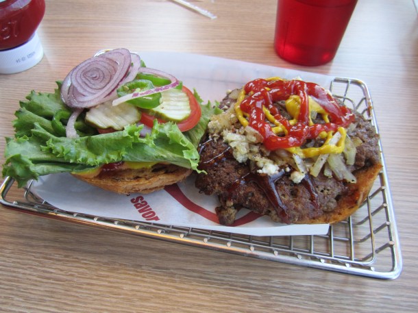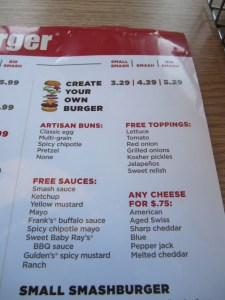 Even though their sign outside looked oddly like Gamestop’s, I walked into a nicely decorated restaurant that had a very casual vibe going for it. The staff was very attentive and even offered to explain any questions we had with the menu or the company in general. I ended up ordering the build your own burger with the Big Smash option which is a full 1/2 pounds of black Angus beef that is freshly prepared in the kitchen.