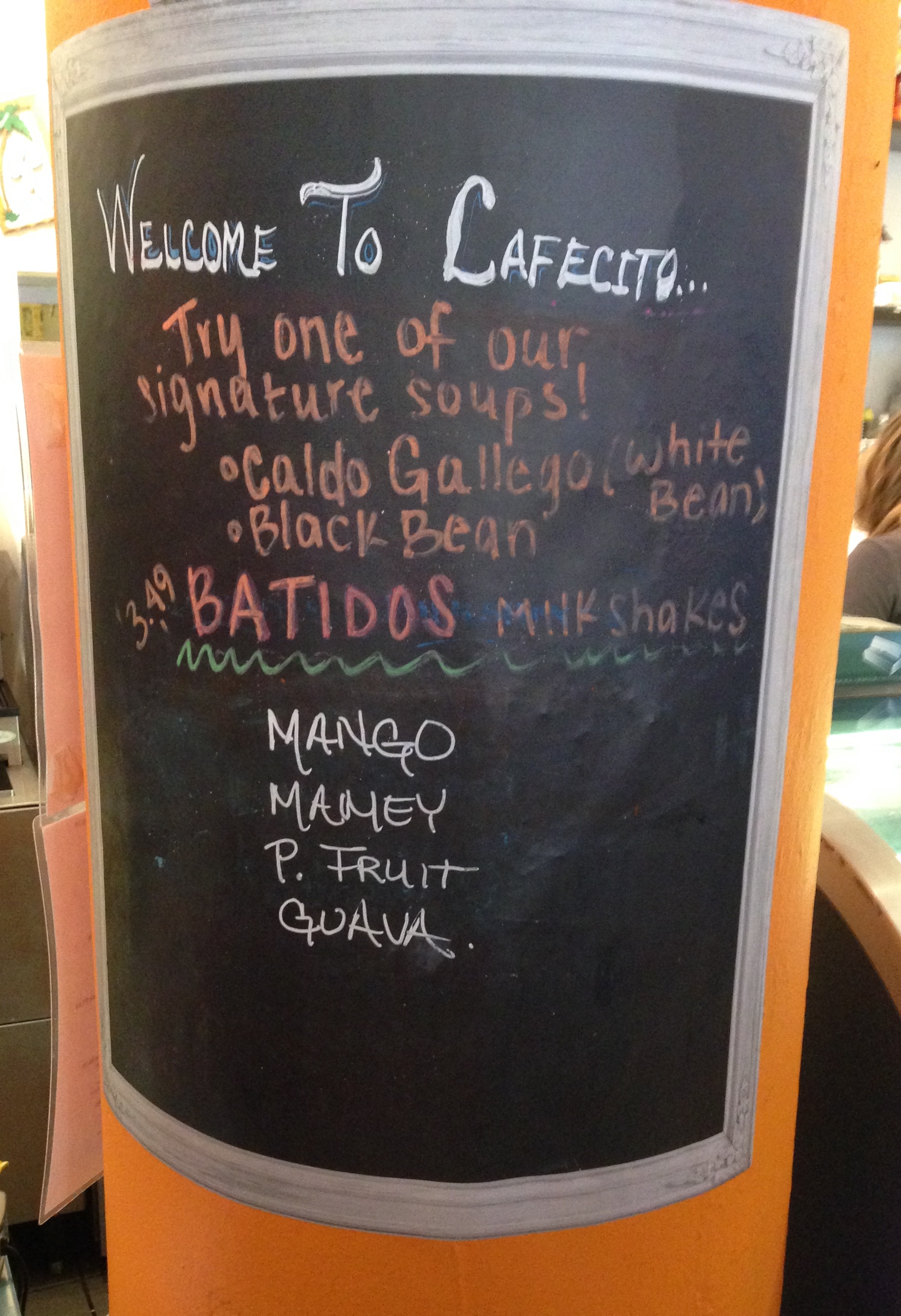 I went there around noon after teaching at Roosevelt U.  IMG_4510If you do not like crowds or waiting in line, pick some other time to go.IMG_4507 Looking over the menu, I had no clue which sandwich to pick because they all looked so scrumptious.  Would I go with the Perfect Cuban sandwich in Chicago ($5.79) or the Spanish stylized “Elveez” made of sweet plantains, guava jelly, and peanut butter($4.99)?  Instead, I got the Jerk sandwich since I wanted to see their take on the traditional Jamaican spiced dish in handheld form ($6.19).  To drink, it was hot outside, so I looked at their “batidos” or milkshakes in English.  IMG_4497One selection that caught my eye was the mamey option.  I had absolutely no clue what it was, but I knew I had to try it.  After the meal, I found out through a little research that mamey is actually the natural fruit of Cuba, so it was my own way of saying “Viva la revolucion!”.  They take your name, and then you have to wait amongst the waiting throngs until they shout you out.  The waiting time flew by as I inspected the walls that were decked out with all types of accolades to Cafecito’s place in sandwich Valhalla.  IMG_4508After taking in all of the hype, my time had come to finally see if this sandwich was all that and a side of chips.  First, I took a sip of my mamey milkshake.IMG_4502There were hints of sweetness, but it really didn’t taste like anything I could definitely put my finger on.  Maybe it could be likened to  a blander version of a taro bubble tea, but it’s a huge shot in the dark.   However, the Jerk sandwich was full of flavor.IMG_4504 While I wouldn’t liken it to the bold and savory spices known to the world through Jamaican cuisine, but there was a definite red pepper undertone to give the meal a great punch with every pressed/toasted bite of the fresh Cubano baguette.  I personally thought that they heaped a bit too much lettuce on top which got in the way of the juicy, all-white chicken breast that was slathered with habanero lime mayo.IMG_4505 With the mayo, I couldn’t really taste it over the red onions, but I love mayo in any way, shape, or form.IMG_4506 Taken as a whole, it was a fresh sandwich with plenty of high quality ingredients but with the improper ratio of certain ones like red onions and lettuce.  Maybe next time, I’d try their Cuban pork sandwich.  Overall, it was a visit that was well worth the walk down from work.