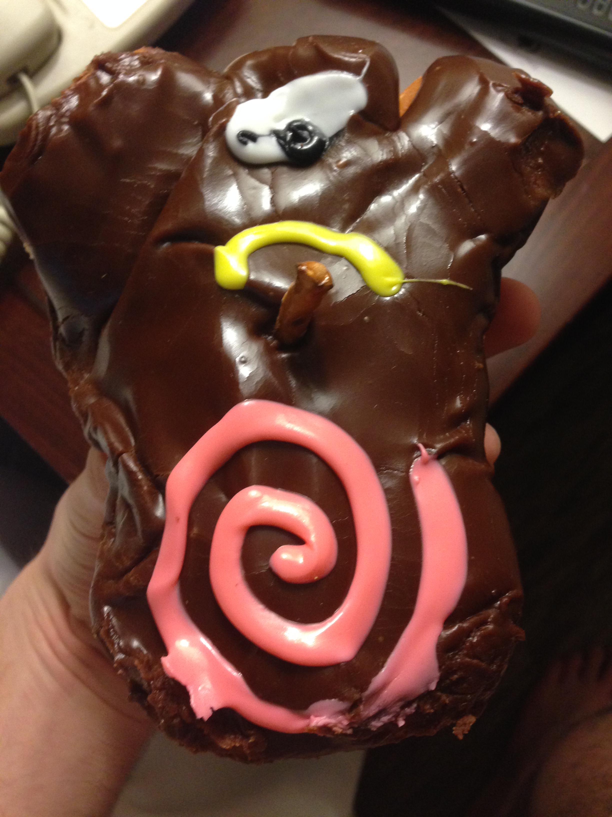 Their menu was as eclectic as their decor as I didn’t have any clue what to get. I saw most people were ordering a dozen doughnuts each, but I didn’t really want to end up as round as a doughnut by the time the night was over. After attempting to ask what the girls in the bachelorette party would recommend I should get, they all seemed deadset on the bacon maple bars…boring. I know you can get those in other doughnut shops in the USA. So, I first went with Voodoo Doughnut’s signature voodoo doll doughnut since I felt obligated to try it. Then, for my second choice, it was extremely tough to choose. The Mexican hot chocolate really was calling to me along with the Butterfinger chocolate and Marshall Mathers doughnuts. However, one won out as I made my choice: the O.D.B. (Old Dirty Bastard) doughnut. I had no clue what was on it, but I picked it since it pays homage to ODB, the Staten Island rap group Wu Tang Clan’s wackiest, most drugged out, and quite possibly mentally handicapped member. I present Exhibit A and Exhibit B. Requiem in terra pax, dawg. If this doughnut was as crazy as him, I expected a real treat, and a treat I did receive. I ate one for breakfast the following Friday and Saturday, and the Voodoo Doll doughnut went first. First, it wasn’t as neat as I was expecting the doll to be since it didn’t seem to have a face or any sort of discerning facial features.