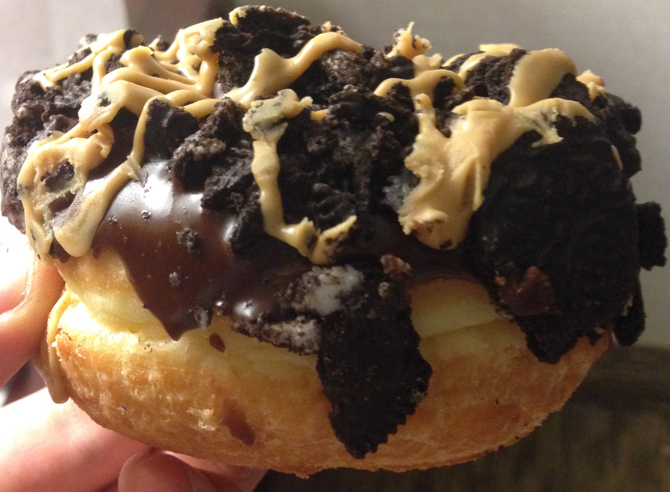 It started with a traditional yeast-raised ring doughnut with the same dough as the Voodoo doll along with a similar chocolate frosting on top. Then it got extra dirty with the giant, crunchy chunks of Oreos heaped on top that were then tricked out with a generous drizzling of peanut butter.