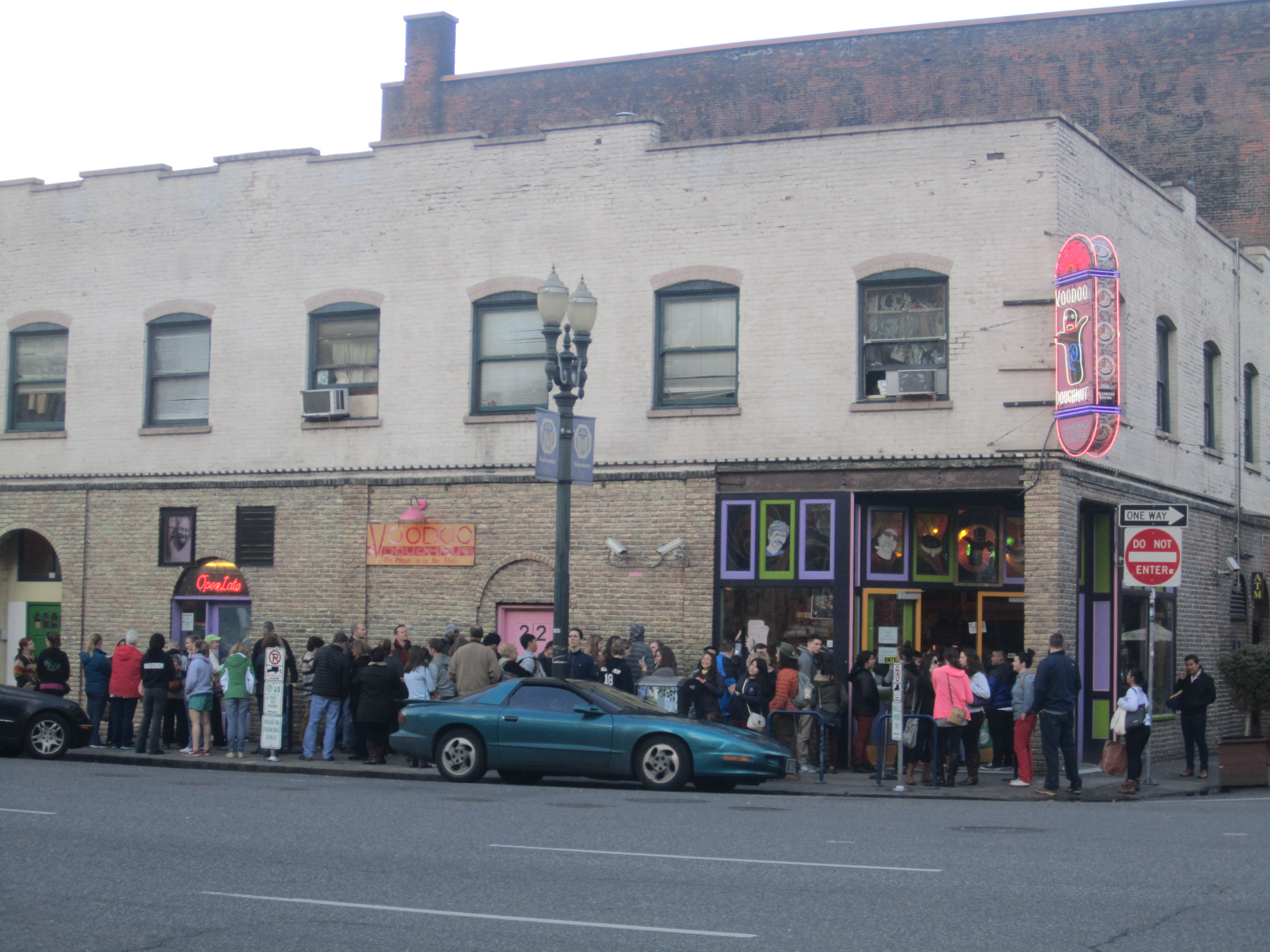 Ever since I’ve been watching the Travel Channel regularly, which has been a very recent practice, Voodoo Doughnut has always managed to pop up on some sort of wacky food program or just general tourism show. Why would that be? Well, Voodoo Doughnut isn’t your typical mom and pop bakery. This franchise delves into the darkest realms of the occult religion and comes up with some culinary creations that only a the craziest houngan (voodoo priest) could imagine. Not only that, but this establishment allows people to be wed through their shop. Tie the knot with a couple knotted cinnamon twists? Only at Voodoo Doughtnut! They offer basic, non-legal weddings for $25 all the way to the “Whole Shebang” package for $6,600 that includes airfare, hotel, legal ceremony, and a tour of Portland. I could go on and on about what makes this place so unique, but I was surprised to hear Portland natives’ reactions to my delight in going to Voodoo Doughnuts. Most were begrudgingly accepting of this bakery like it’s the popular kid who’s really loud and obnoxious yet everyone wants to be his/her friend. While others seemed to be happy that I tasted probably the most popular part of the Portland culinary scene. This general joy was reflected in the omnipresent line I saw outside their original location at 22 SW 3rd Ave.