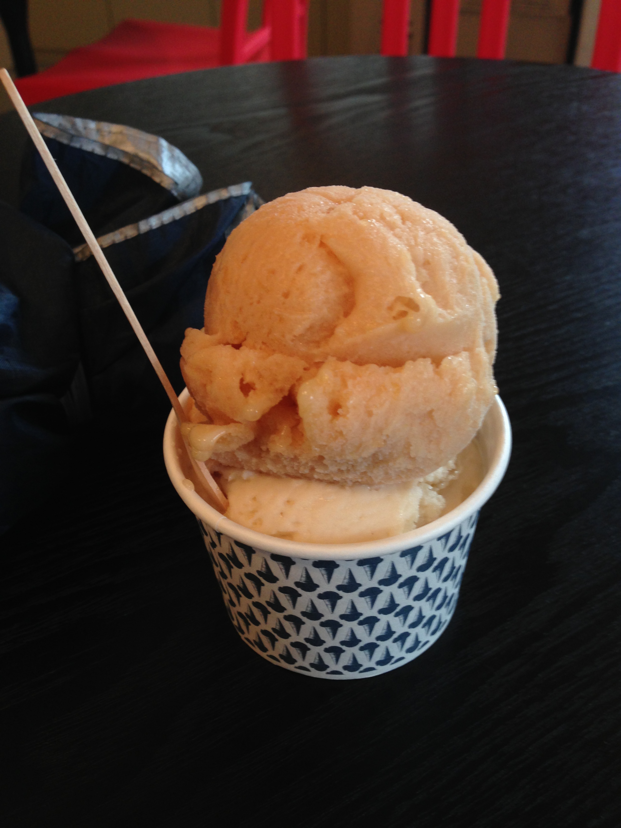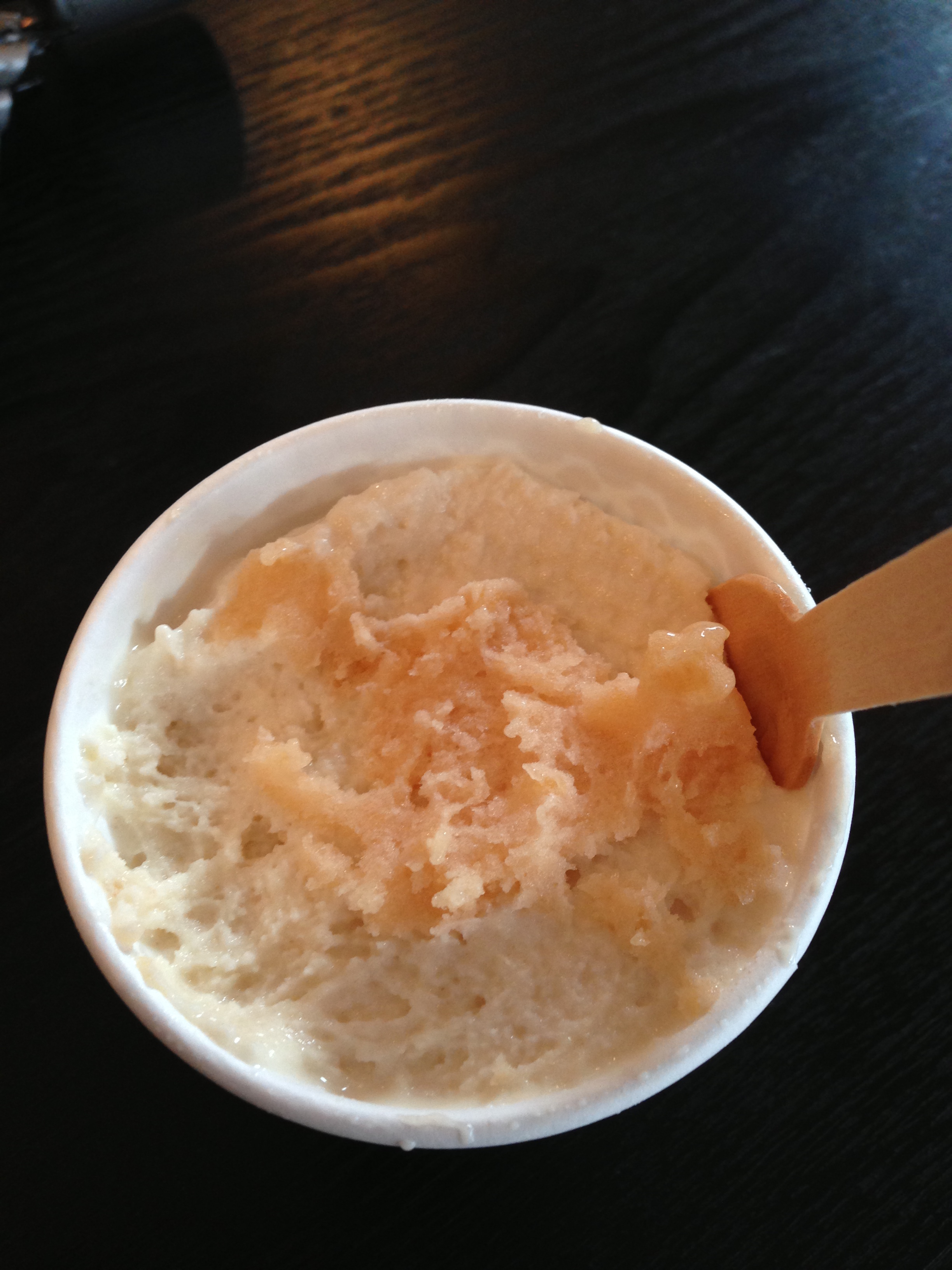 The owner was very friendly and allowed me to sample some of the flavors. I settled for the double cup (8,000) of Makkeoli (rice wine) ice cream and mango hibiscus sorbet. He gave me two pretty decent scoops, and I was definitely blown away by both of the flavors.The mango was on top, and I greatly enjoyed its tropical sweetness that was paired with a slight floral undertone.