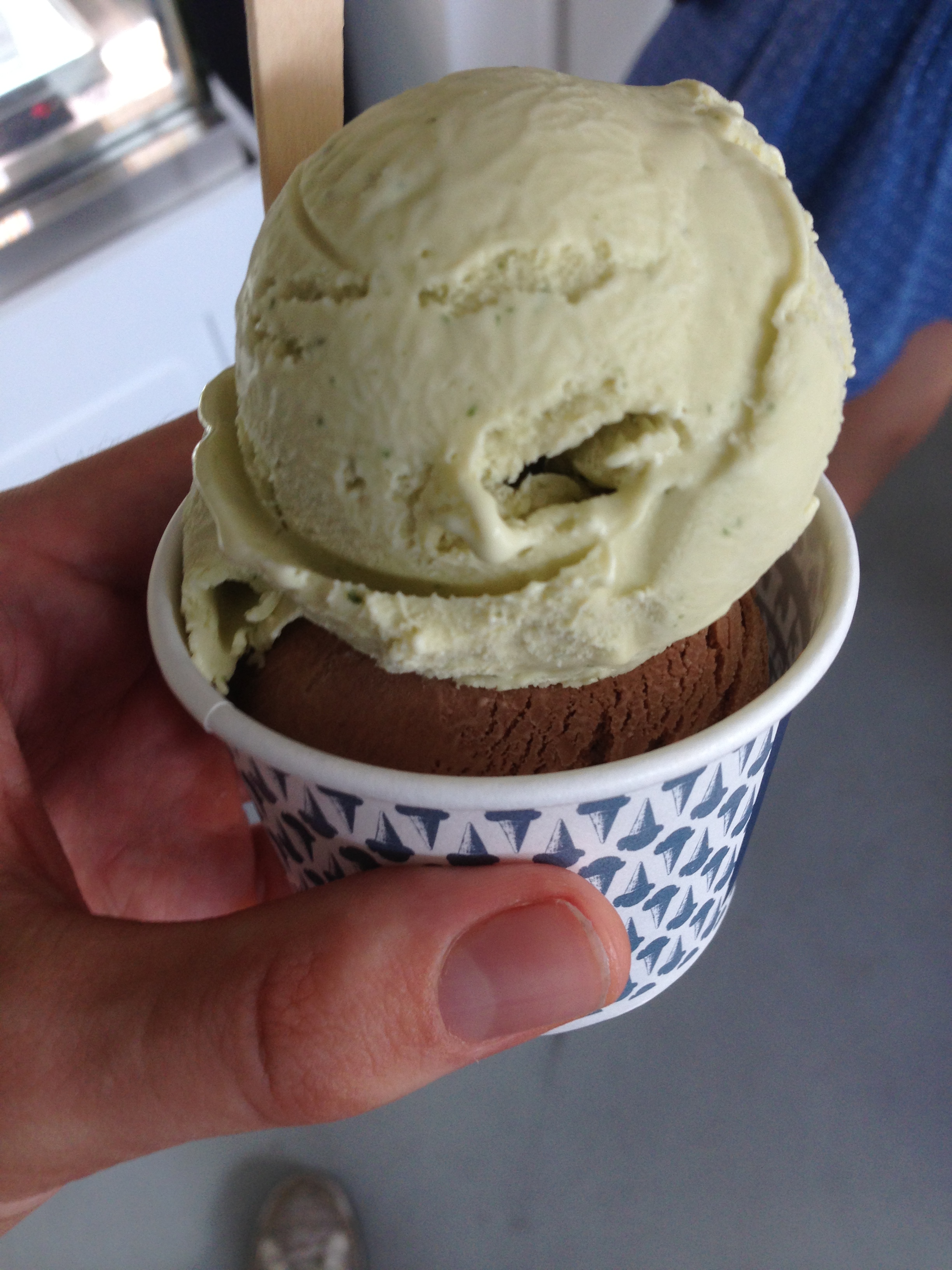 Today they had the type of ice cream that I was expecting from the Cali transplant. I got a double with a scoop of perilla or sesame leaf ( 깻잎) leaf ice cream and then a scoop of All Black which was a mix of Guinness and chocolate.