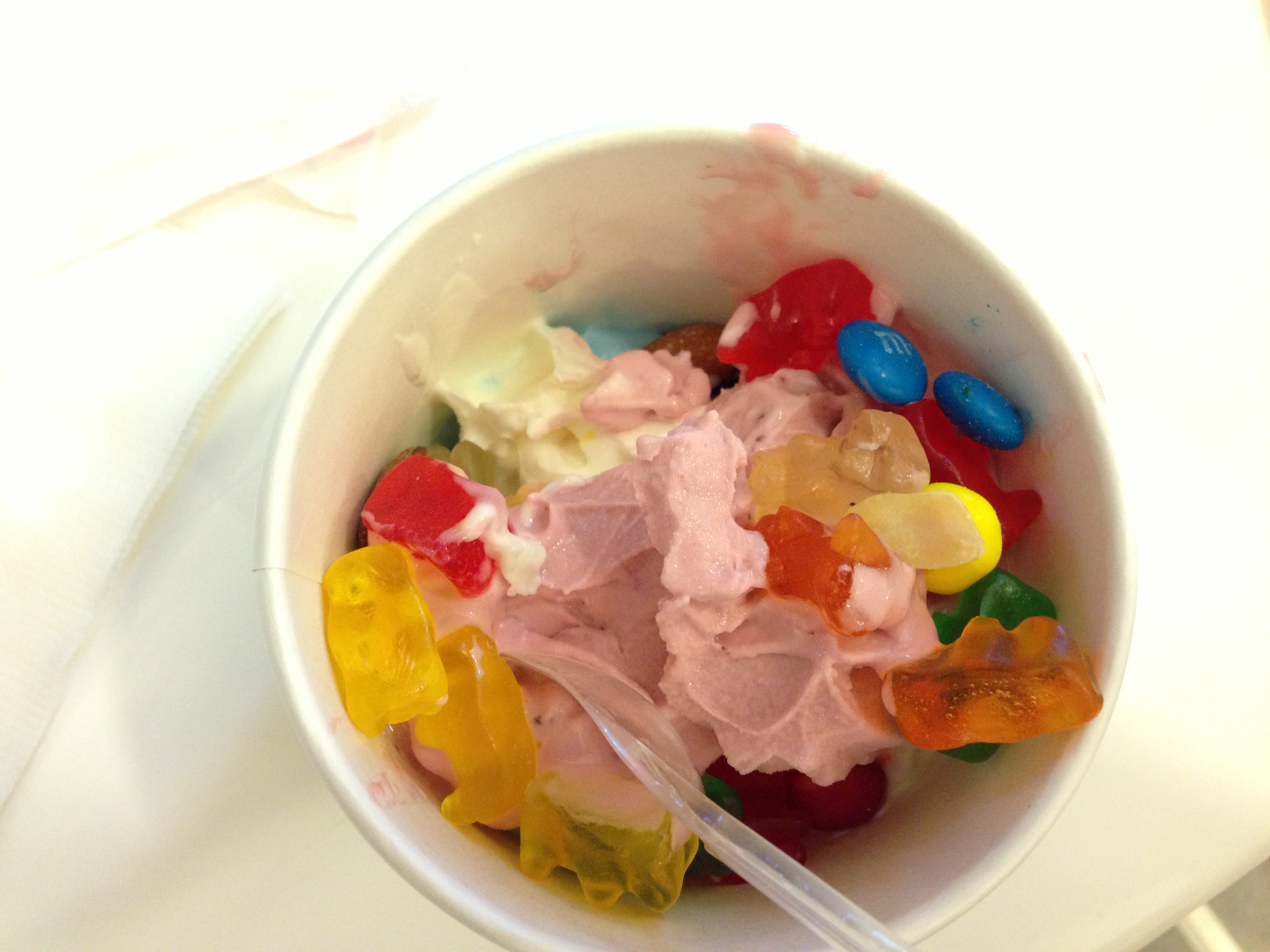 Though this wouldn’t be the first time I ate ice cream made with rice. The last flavor I got was blackberry. I can only take so much razzmatazz in one cup. I garnished my creation with some trail mix and gummi bears since I can’t say no to any form of gummi candy. They charge you by weight, so I paid about 5,000 Won for a good amount of ice cream.
