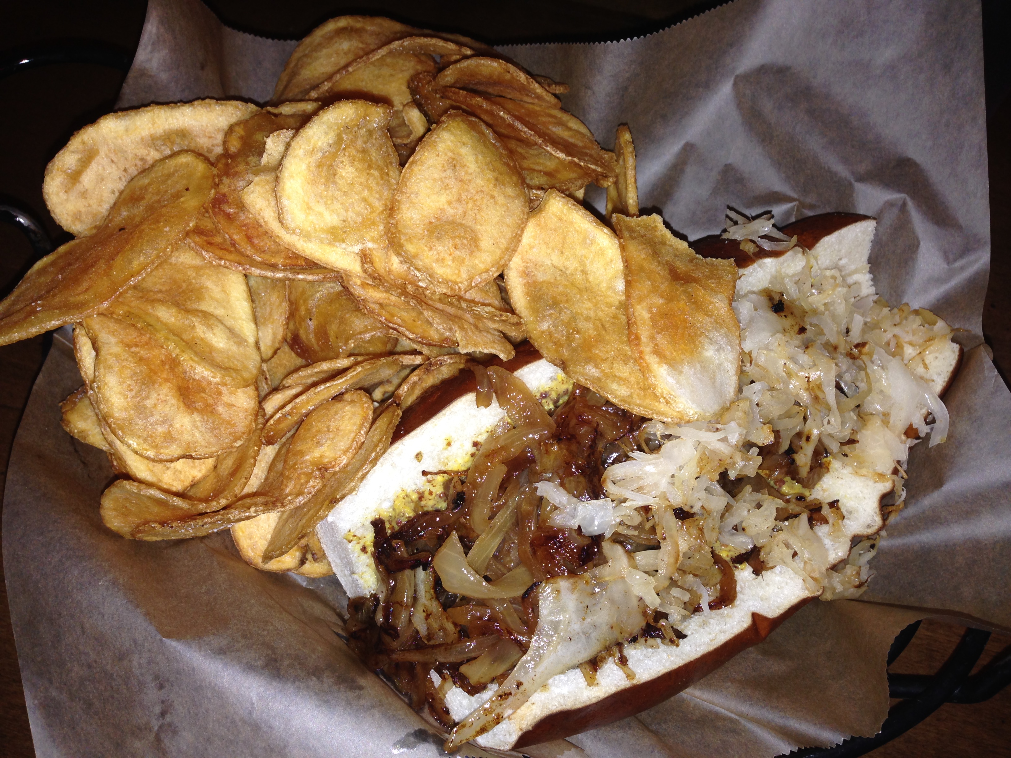 It was like any other modern American gastropub with exposed brick, dark accents, wooden chairs, and random neon beer signs. We sat down and were greeted with a monstrous beer menu. As I leafed through the 25 pages of beers, I was overwhelmed with making a selection. However, once I was finished reading the tome, I settled for a kolsch to go along with my bratwurst entree. What better than a German beer to accompany a German meal? My mom got the cole slaw burger which I had a natural aversion to since it was carrying the stepchild of potato salad in my eyes when it comes to picnic side dishes. When all of it came out, it didn’t look like the most appetizing meal in the world, but I’d let the flavors do the talking. Kolsch or Kölsch beer is a German beer that was invented in Cologne in English or Köln, hence Kölsch. It is a light yellow, pale ale which is quite rare in the land of lagers, but thankfully the hops are not over the top. Instead, it has a bit more body than your average lager and a more floral/fruity quality to it. Definitely more of a summer beer if you’re looking for something light and crisp. It paired very well with my bratwurst. The word bratwurst comes from the German words “brät” or “finely chopped meat” and “wurst” or “sausage”. They were actually made popular throughout the USA compliments of the Milwaukee Brewers baseball franchise where even today brats still outsell hot dogs. Beer Market’s take on the bratwurst had slight riffs on the original sausage.