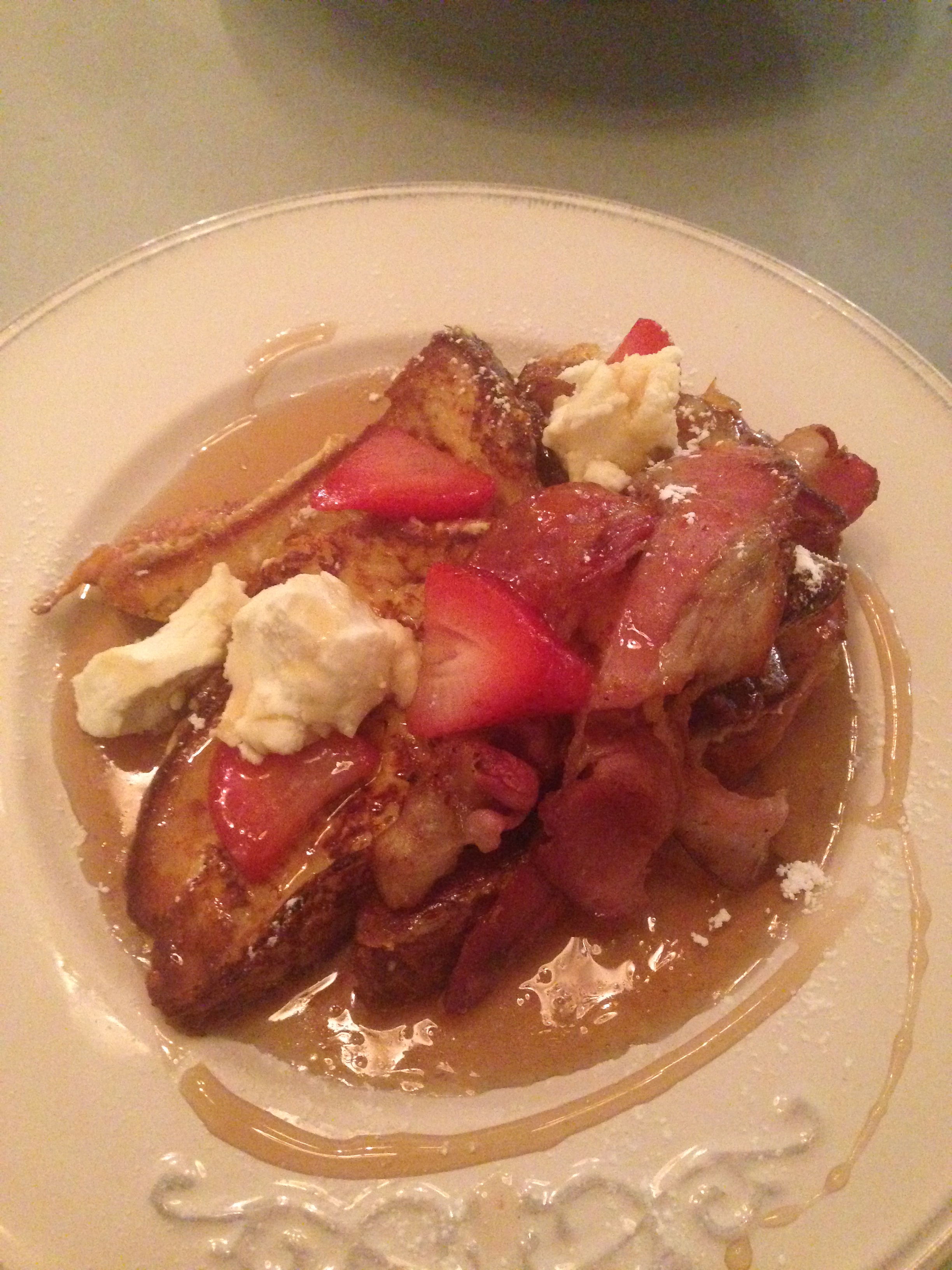 It started with fried pieces of cinnamon-orange brioche that were then covered with candied pecans, bananas, and lying on a criss-cross of fresh blackberry preserves.